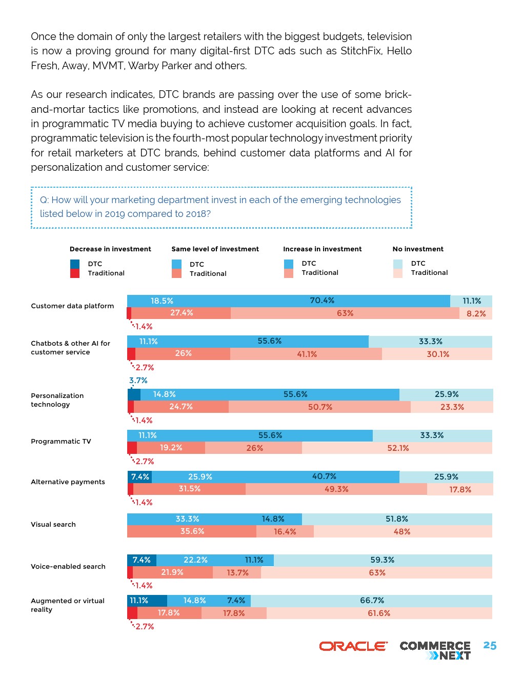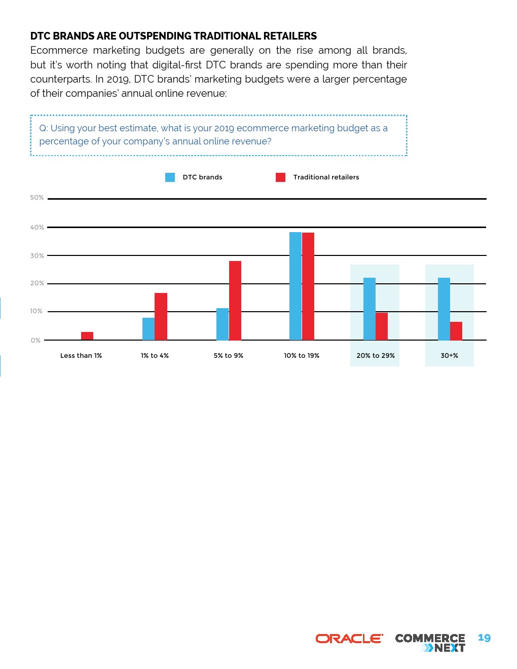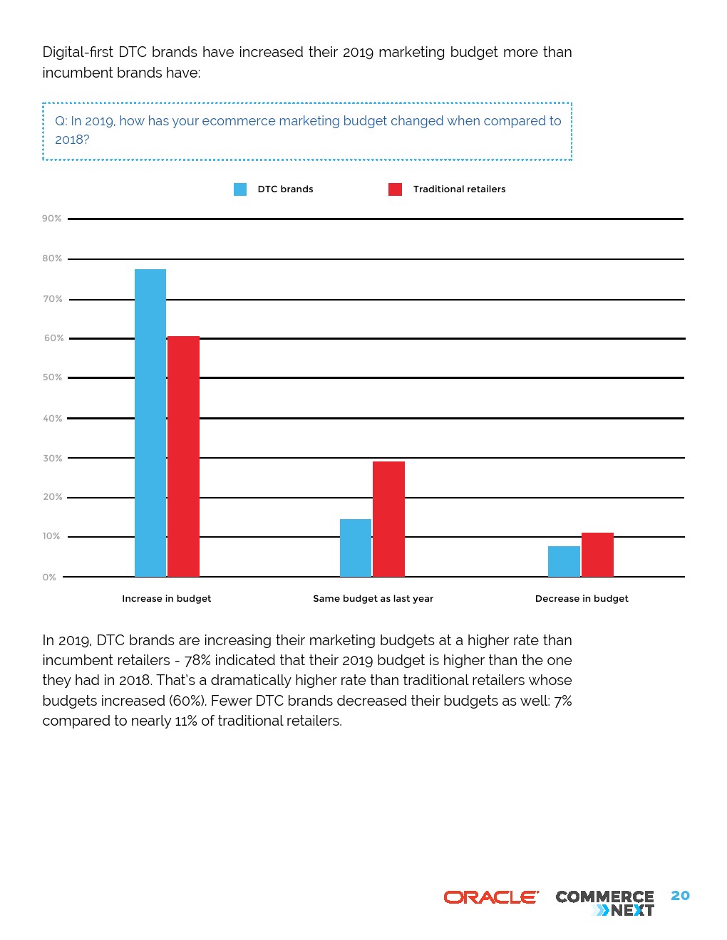 与2018年到2019年相比,电子商务营销预算在所有零售业务模式中都在上升;但是,网络优先的DTC品牌(直销品牌)正在以更快的速度提高预算。