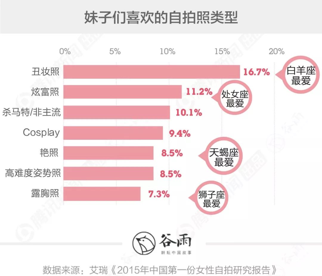 自拍会成瘾,这已令笔者大为不解。更令笔者诧异的是,妹子们喜欢的自拍照类型中,艳照、露胸照这两类竟分别占到8.5%和7.3%的比例。