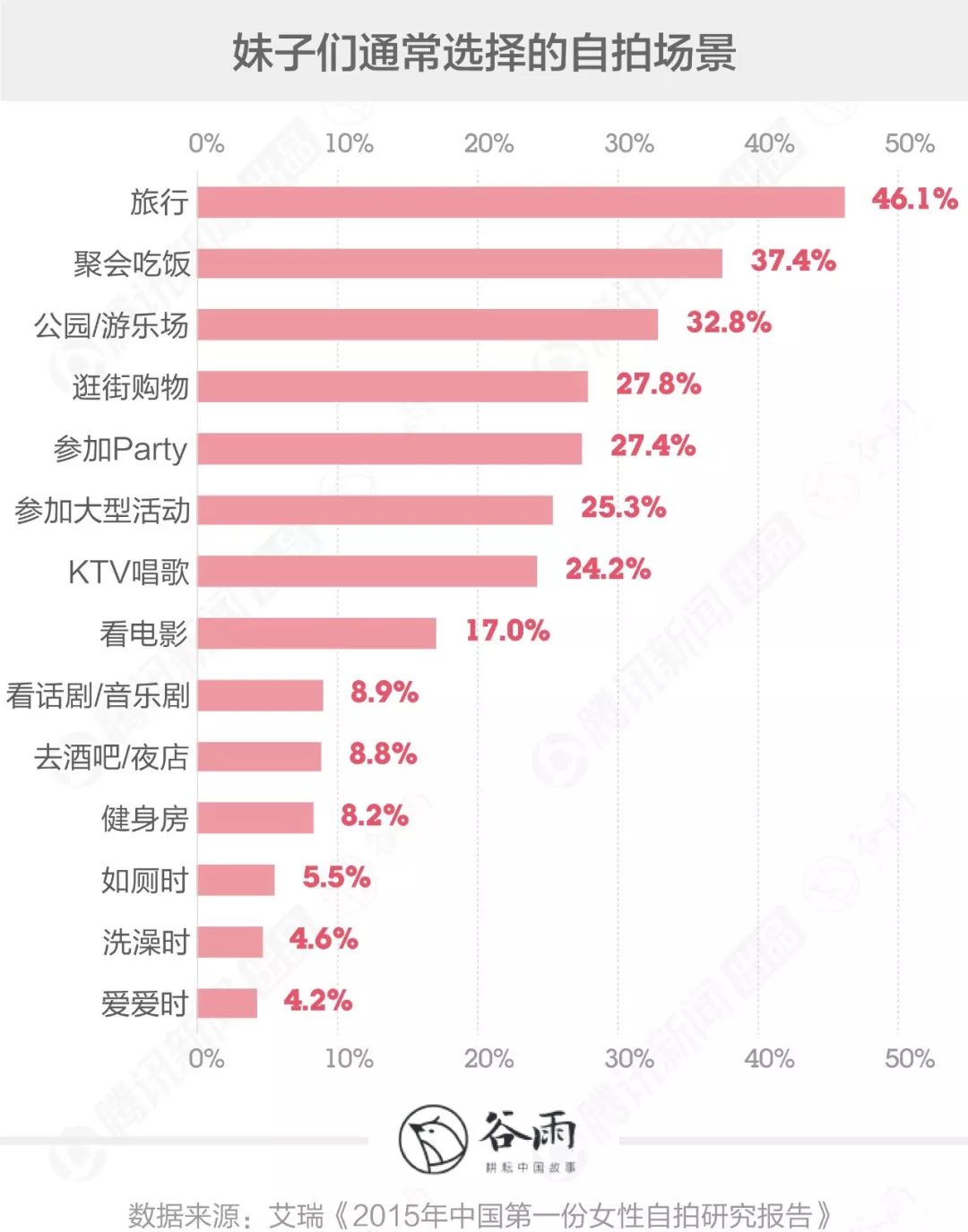 该女性自拍研究报告还称,旅行、聚会、公园、购物、参加party是妹子们最常自拍的场景,但竟然有5.5%的妹子上厕所时自拍、4.6%的妹子洗澡时自拍、4.2%的妹子爱爱时自拍!⑤