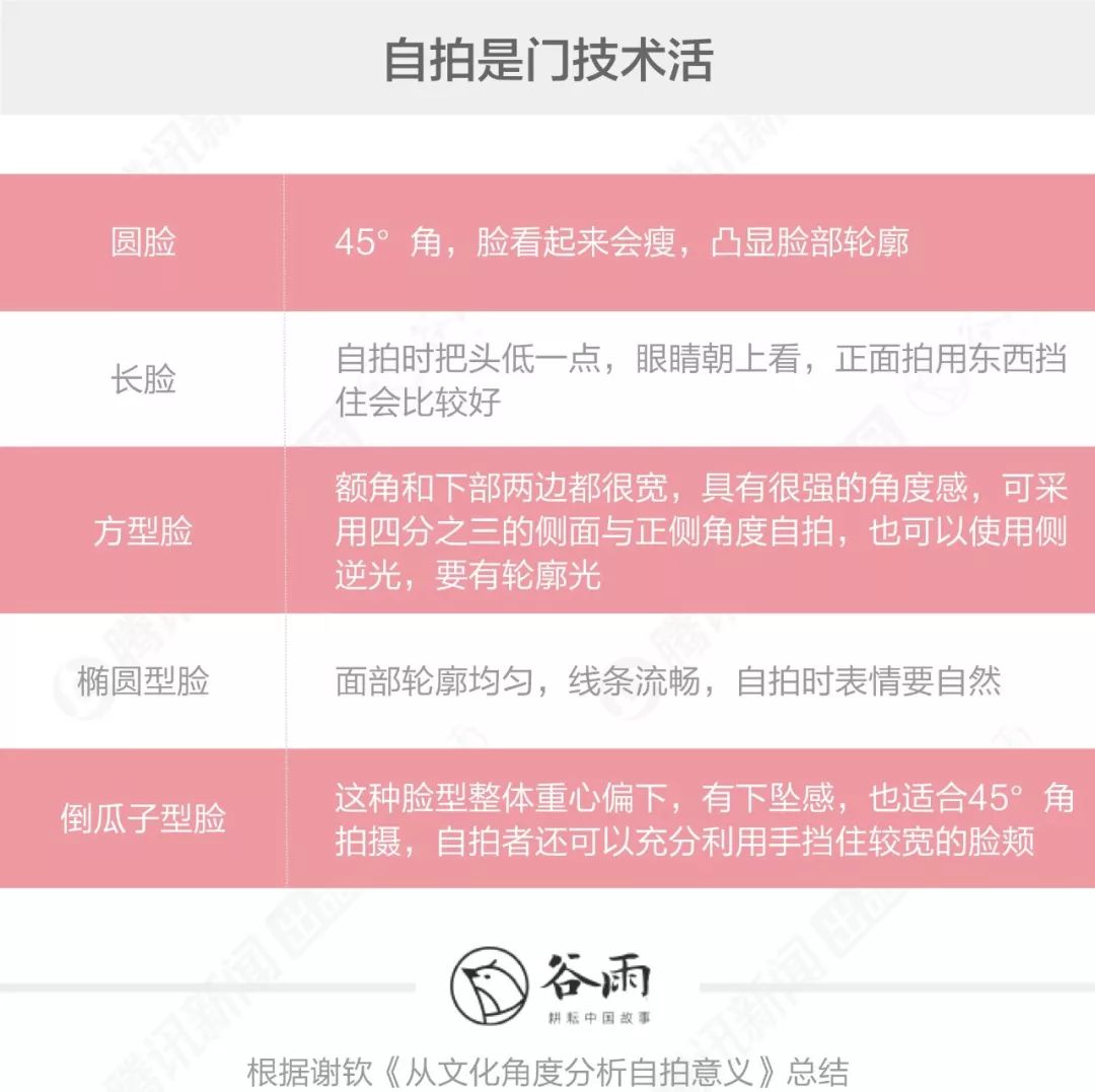 45°角的适用范围很广,尤其是圆脸妹子,此外,笔者查询到的谢钦《从文化角度分析自拍意义》一文,总结了圆脸、长脸、方型脸、椭圆型脸等几个常见脸型的自拍技巧。