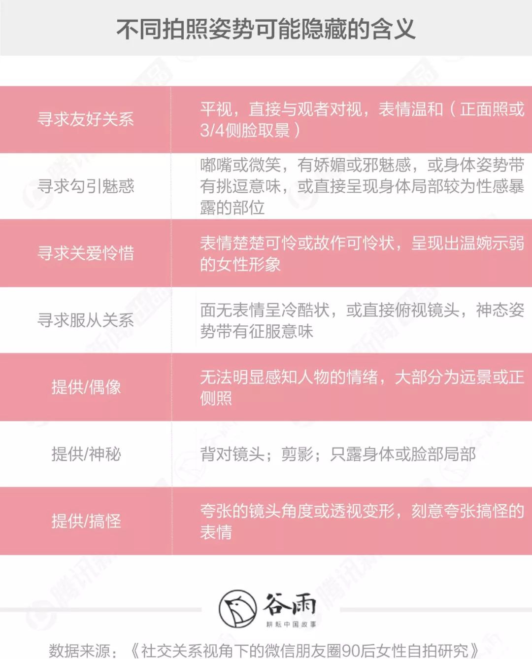 研究显示,不同拍照姿势可能隐藏了不同的含义,比如,自拍者与观者平视,往往是在寻求友好关系;而人物表情嘟嘴、微笑,或身体姿势带有挑逗意味的自拍照,则是在寻求勾引魅惑;人物表情楚楚可怜或故作可怜状,则很可能是寻求关爱怜惜。