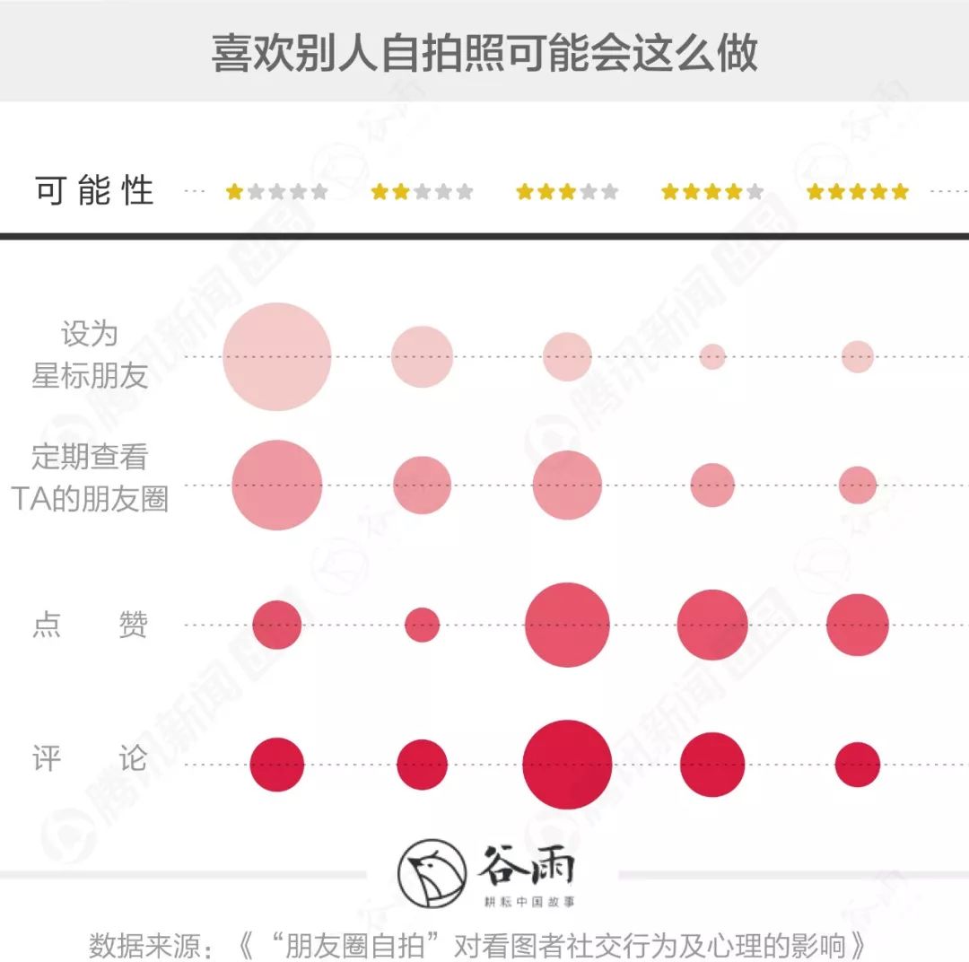 因此,数据显示,如果喜欢别人的自拍照,围观者最可能的互动就是点赞(得分3.35),这当然也与点赞轻松易操作有很大关系;其次是评论(得分2.99),然后是定期查看Ta的朋友圈(得分2.24),最后是设为星标朋友(得分1.75)。⑯