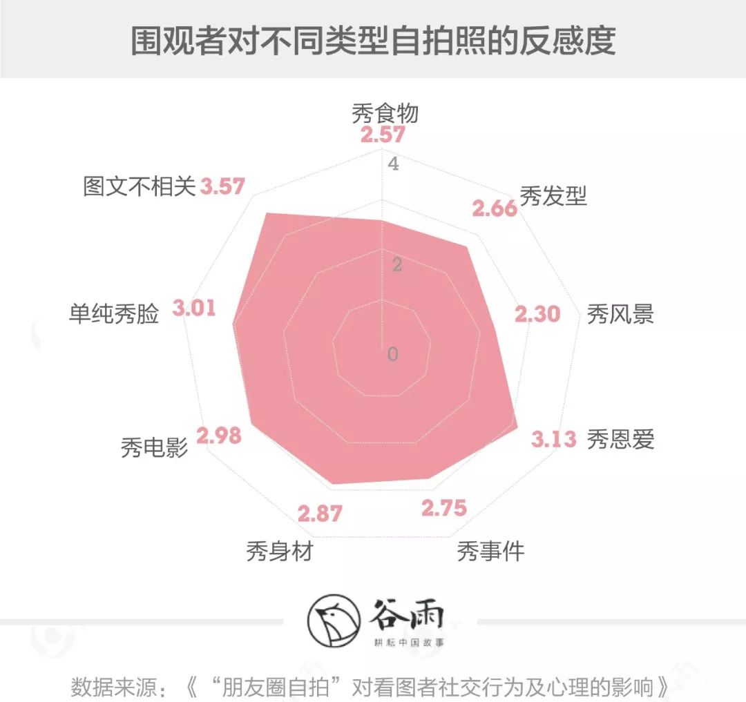 但颜值再高也不能任性。秀风景、秀食物、秀发型,可以,这三类是围观者接受度最高的自拍照类型;单纯秀脸就拉仇恨了,秀恩爱不只死得快还招黑,最让人恨的就是图文不相关。这三类也就成为围观者接受度最低的自拍照类型。