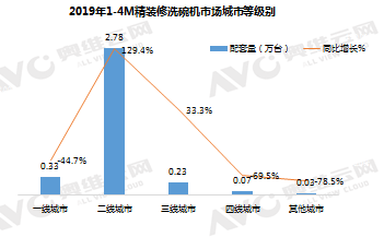 从城市级别来看,二线城市增长幅度最大,与2018年1-4M同比,增长了129.4%。一线城市(北上广深)洗碗机市场配置了0.33万台,同比下降了44.7%,配套项目7个。
