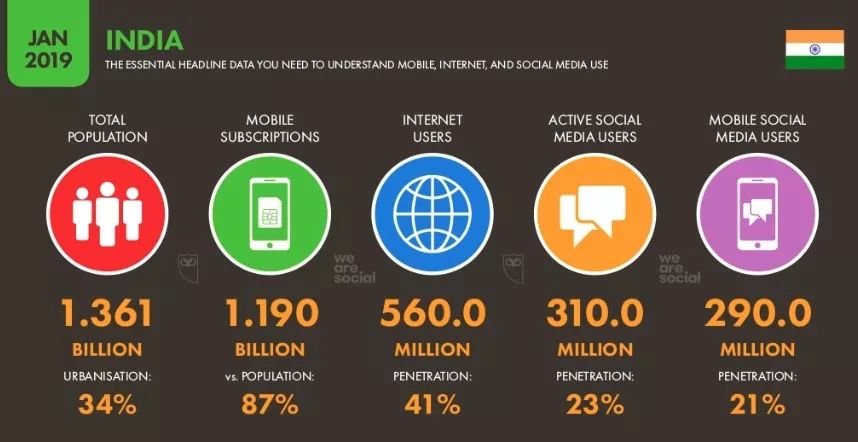 据《全球数字化统计快报》数据:截止2019年1月,全球76.76亿人口中,互联网用户达到了43.88亿,整体的数字化渗透率为57%;相比之下,印度的数字化渗透率仅41%,未来有更大的上升空间。数字化大潮将为市场带来更多的增长机会和服务空间。