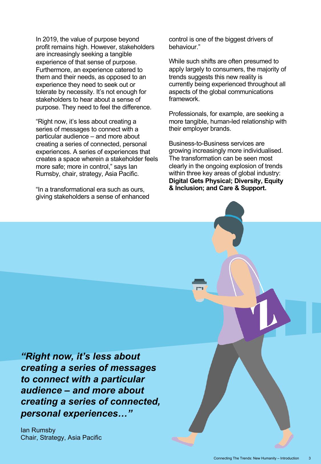 “现在我们不仅要靠传递信息来与受众建立联系,更要打造贴合需求的个性化体验,”亚太区首席策略官Ian Rumsby说道,“要打造让利益相关者更有安全感和掌控权的体验。在剧烈变革的时代里,掌控权是其行动的强大驱动力之一。”