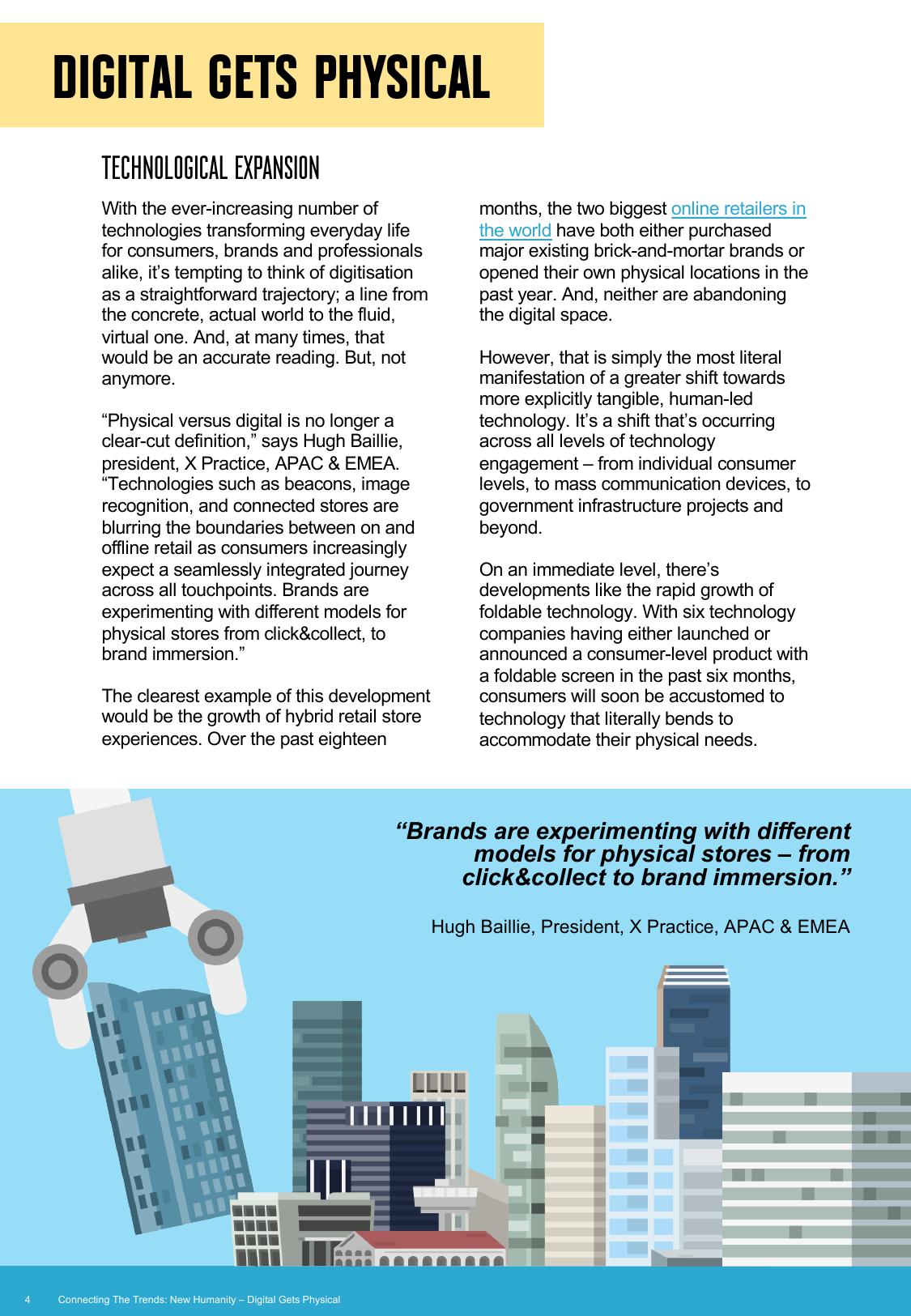 高科技为消费者、品牌和专业人士的日常生活带来了改变。“现实与虚拟世界不再有明确的界限。”X Practice亚太及EMEA地区总裁Hugh Baillie称,“网络信标、图像识别和互联商店等技术模糊了线上与线下零售之间的界限,因为消费者越来越期望所有站点能够无缝衔接。从一键购买、收货到品牌体验,各品牌也都在尝试不同的实体店模型。”