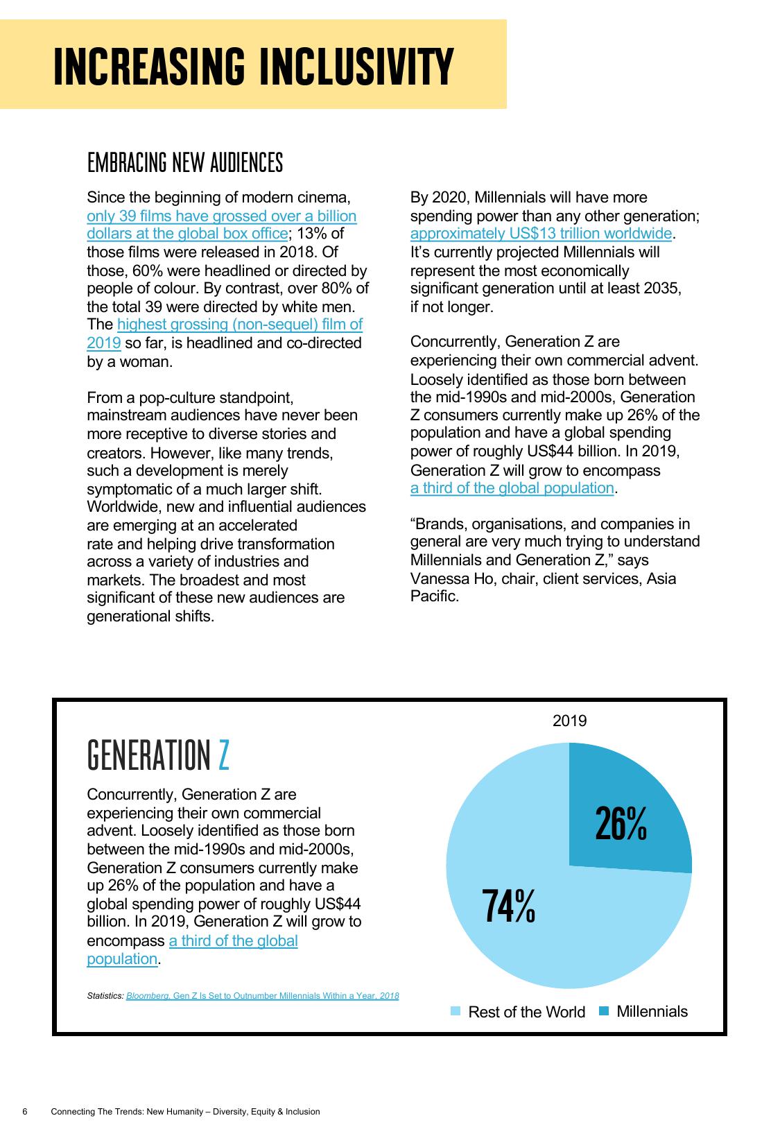 从流行文化的角度来看,主流观众对多样化的故事和创作者身份所持有的开放态度前所未有,这也预示着更大规模的市场转型。全世界正在涌现新一批有影响力的受众,他们将推动各种行业和市场的转型。