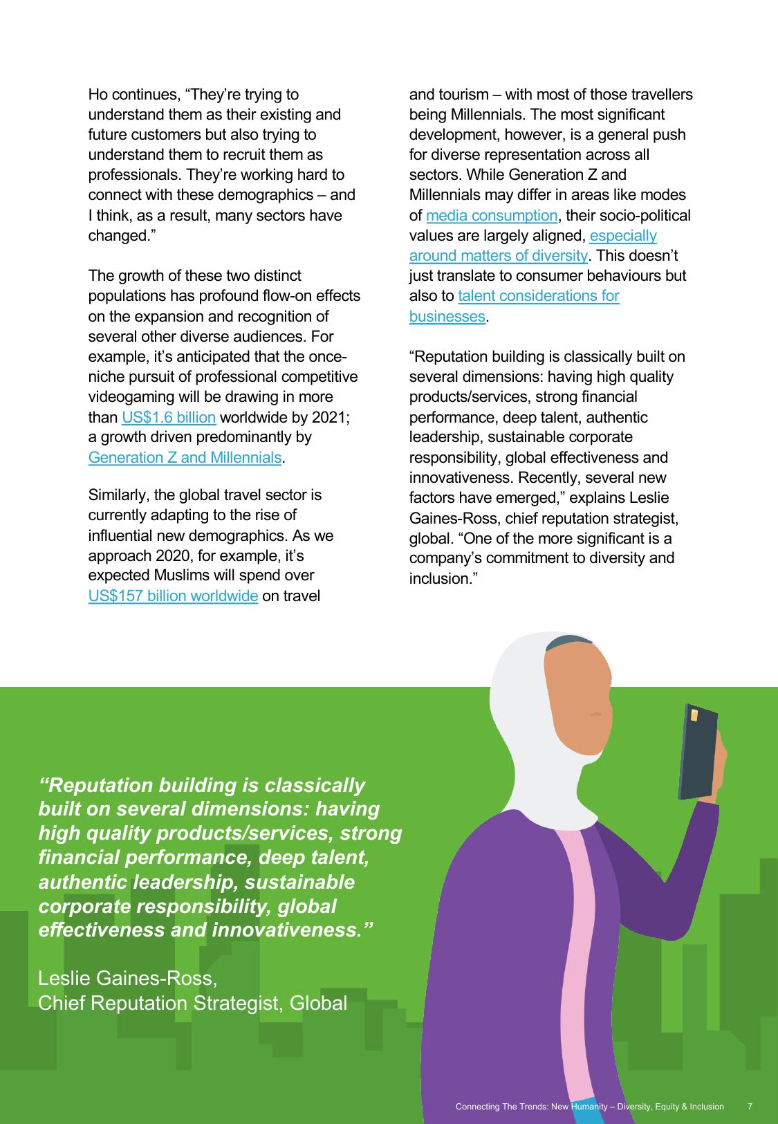 “这一因素对当今的声誉管理体系至关重要。根据我们的调查,这两代有追求的年轻人明显乐于在多元化的场所工作,这也是他们就业的主要参考因素。各公司正在加大资源投入来建设多元化的工作场所,并聘请首席多元化和包容性执行官来实施重要计划。”