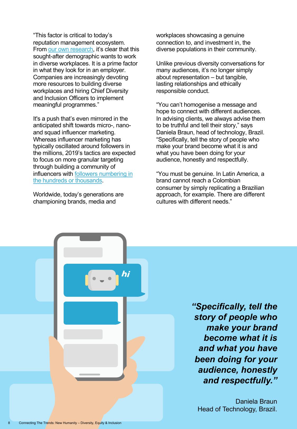 “你不能期望用同一类信息与不同的受众建立联系。在为客户咨询时,我们总建议他们表现得真诚,来分享自己的故事。”巴西技术总监Daniela Braun称,“具体来说,就是以人性的角度出发,诚心地讲述推动品牌发展的故事,讲述品牌为消费者所付出的实践。”