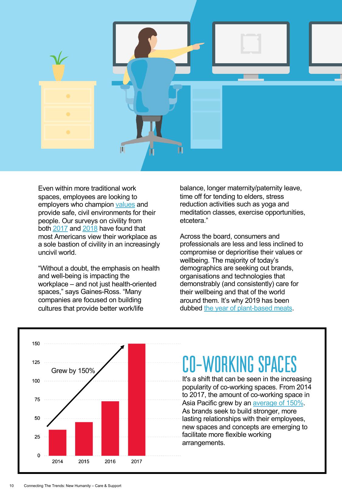 这种转型可以从联合办公空间的日益普及中窥探一二。2014年到2017年,亚太区的联合办公空间平均增长了150%。随着品牌寻求与员工建立更牢固、持久的关系,新的空间和理念正在涌现,以促进更灵活的工作安排。