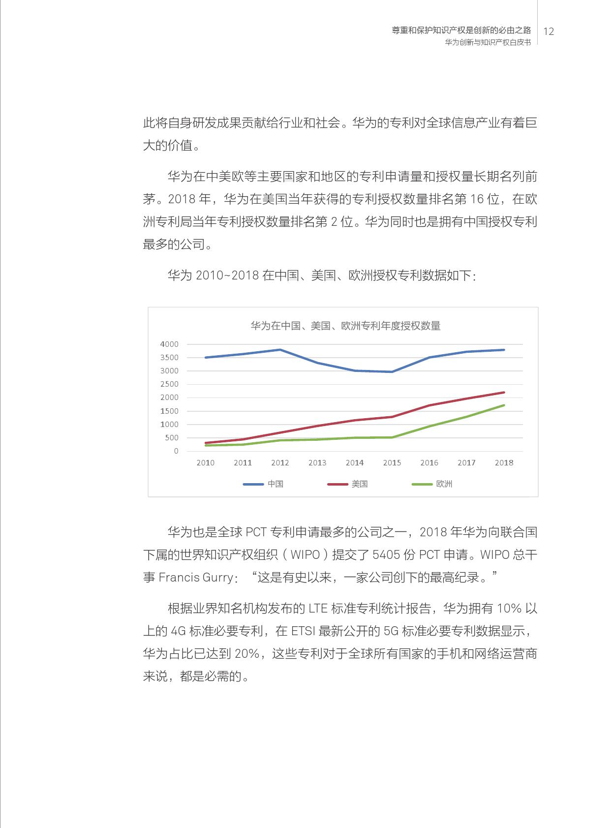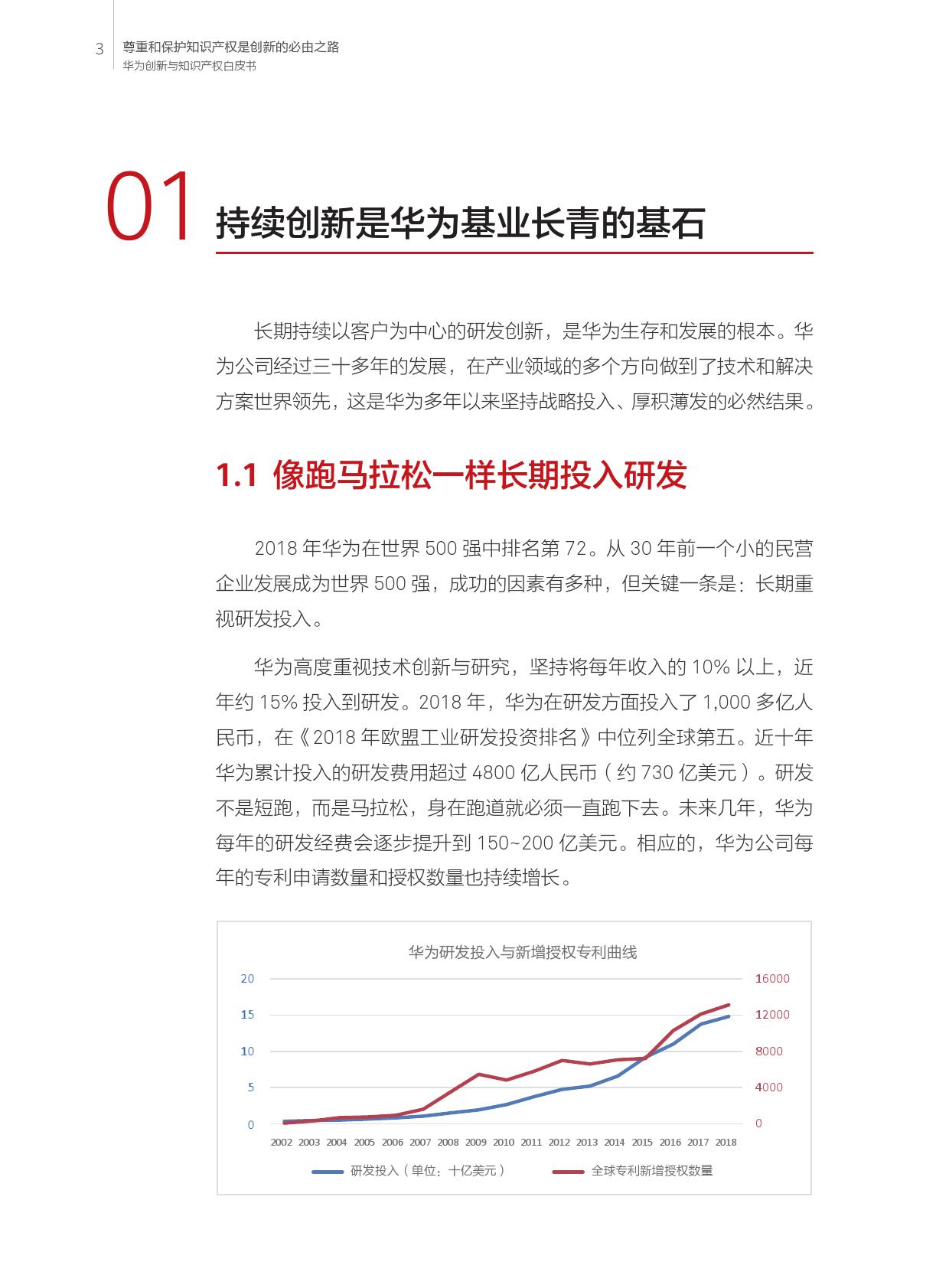 华为高度重视技术创新与研究,坚持将每年收入的10%以上,近年约15%投入到研发。2018年,华为在研发方面投入了1,000多亿人民币,在《2018年欧盟工业研发投资排名》中位列全球第五。近十年华为累计投入的研发费用超过4800亿人民币(约730亿美元)。研发不是短跑,而是马拉松,身在跑道就必须一直跑下去。未来几年,华为每年的研发经费会逐步提升到150~200亿美元。相应的,华为公司每年的专利申请数量和授权数量也持续增长。持续的投入到今天开花结果,转化为我们向客户持续提供创新产品、高效服务的能力。目前,华为的业务遍及170多个国家和地区,服务30多亿人口。