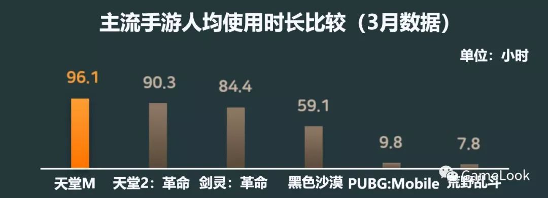 在主流手游中,《天堂M》的3月人均使用时长最高,达到了96.1个小时,非常重度。