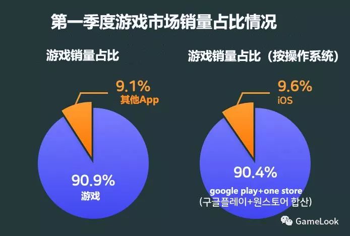 移动游戏收入在整体移动应用市场中占比高达90.9%,相当于其他App收入总和的十倍。而在韩国手游收入中,IOS平台贡献了9.6%,其余为安卓渠道(包含google play及one store)。