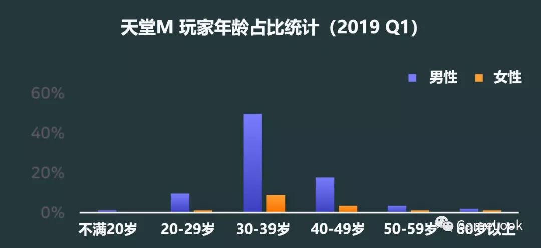 在用户方面,《天堂M》的主要玩家为30~40多岁的男性,而不满20岁的玩家甚至比60岁以上的玩家还要少一些。