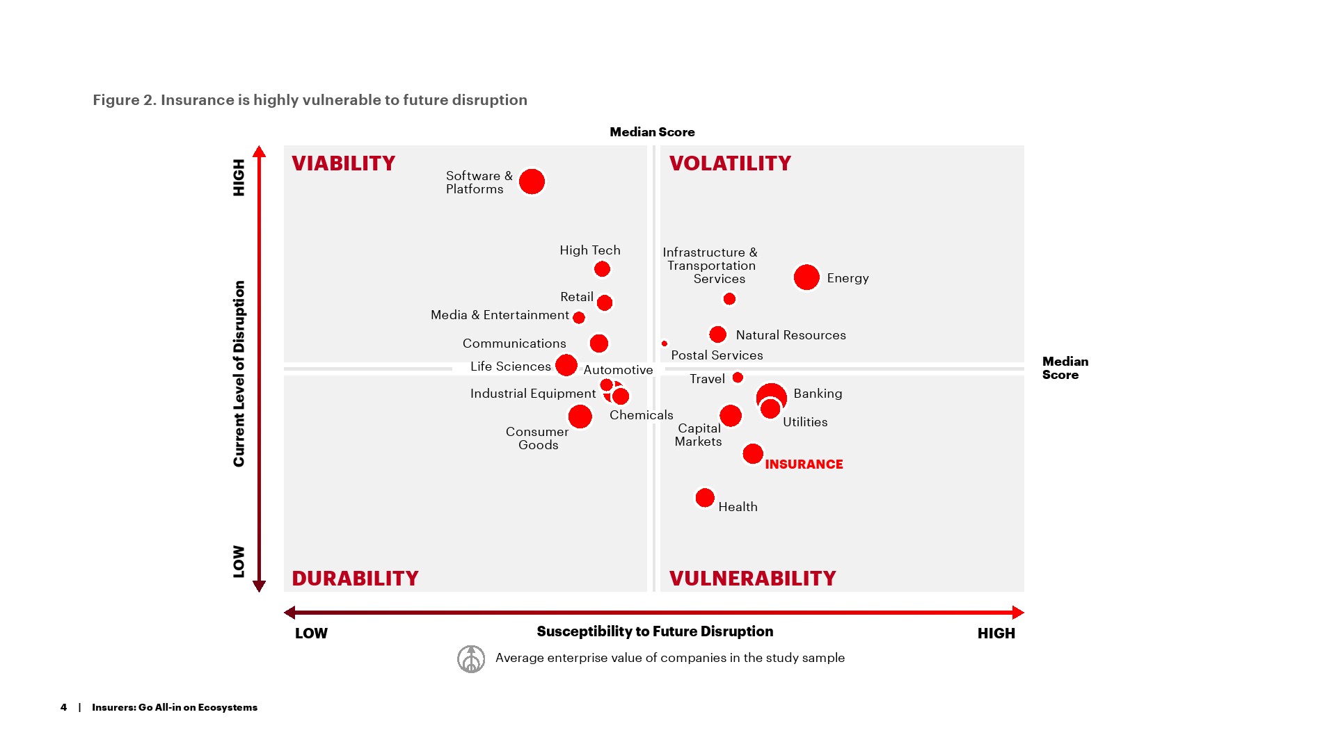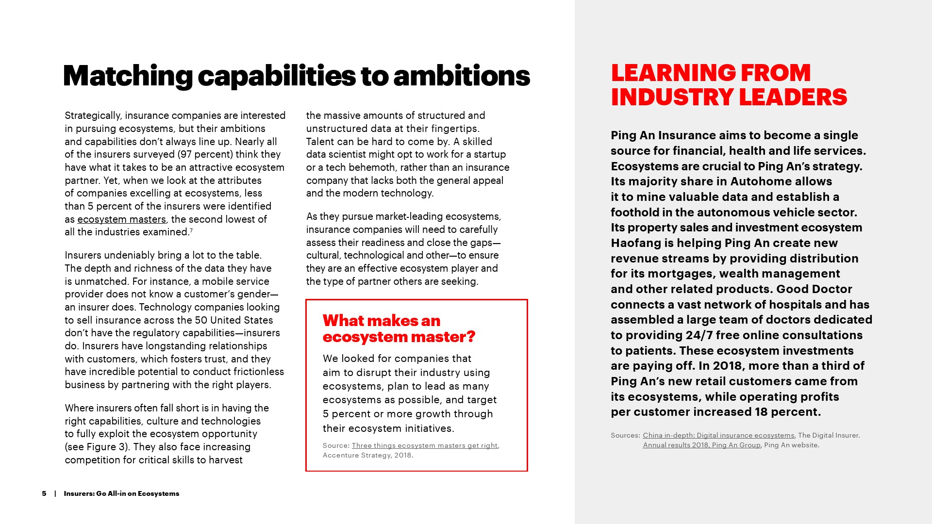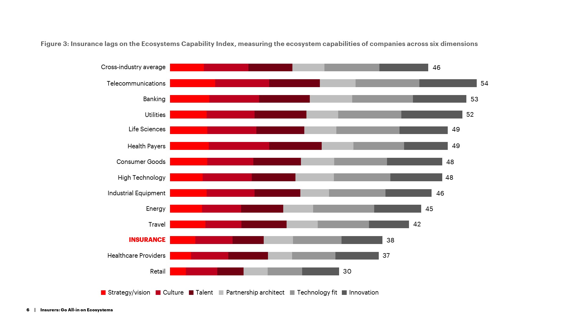 报告指出,只有不到5%的保险公司被称为“生态系统大师”,他们的公司拥有利用生态系统颠覆其行业,并计划引领行业生态系统的能力。从生态系统大师数量方面来看,保险业排名倒数第二。虽然保险公司提供了一些在生态系统中很有价值的关键属性,包括无与伦比的数据深度和丰富性,以及长期的客户关系,但在生态系统战略、文化、创新和技术采用方面,它们落后于其他行业。