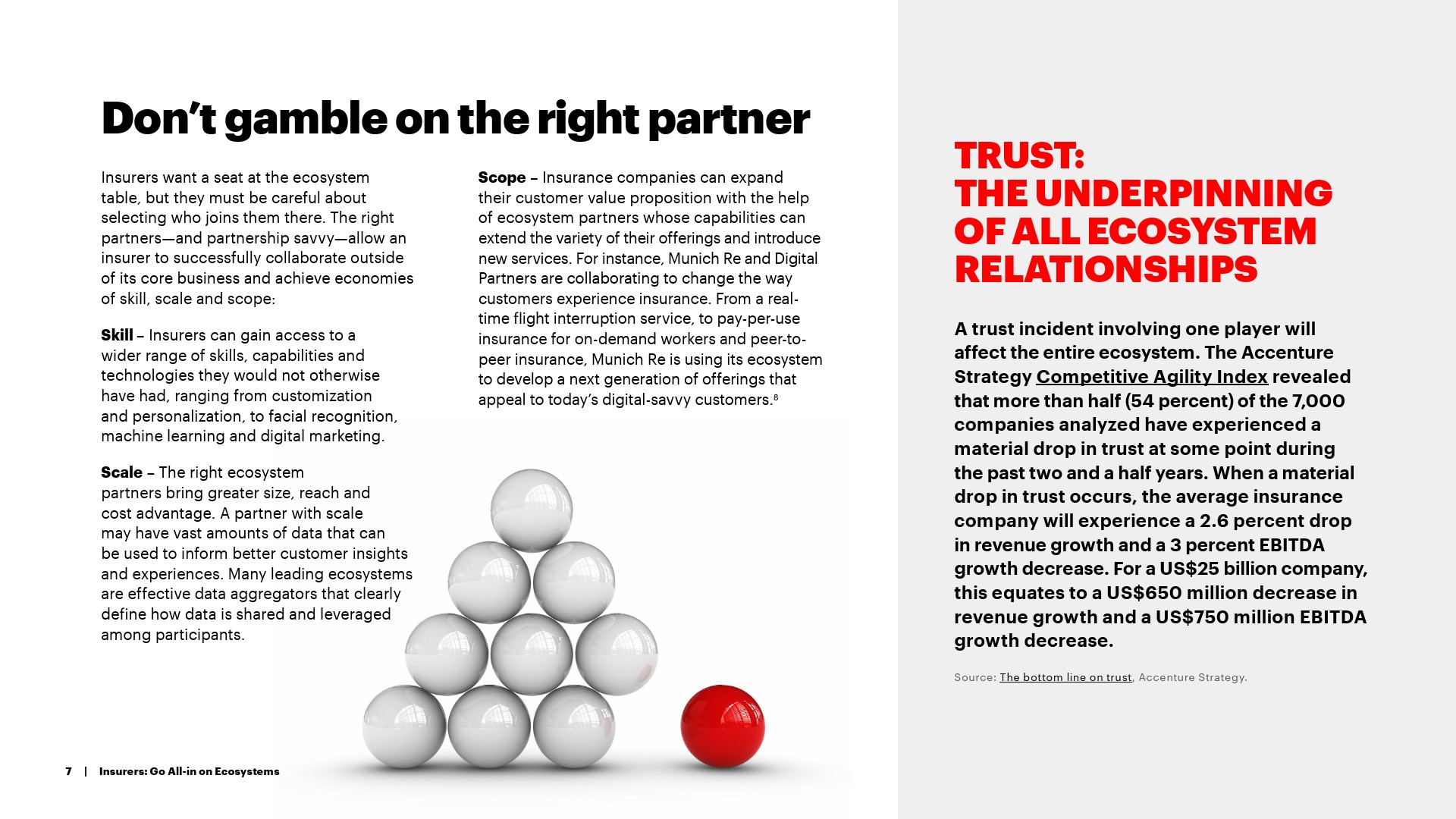 令人鼓舞的是,绝大多数受访的保险公司(97%)相信他们有能力成为一个有吸引力的生态系统合作伙伴。选择能够帮助实现技能、规模和范围的正确、值得信赖的合作伙伴至关重要。保险公司还需要优先考虑其生态系统合作伙伴的安全。埃森哲的研究发现,只有1/4的保险公司(26%)确切地知道,它们的生态系统合作伙伴正在像保险公司自己一样勤奋地工作,以提高它们的安全。如果不把重点放在安全上,就会产生新的风险,损害参与生态系统的价值。