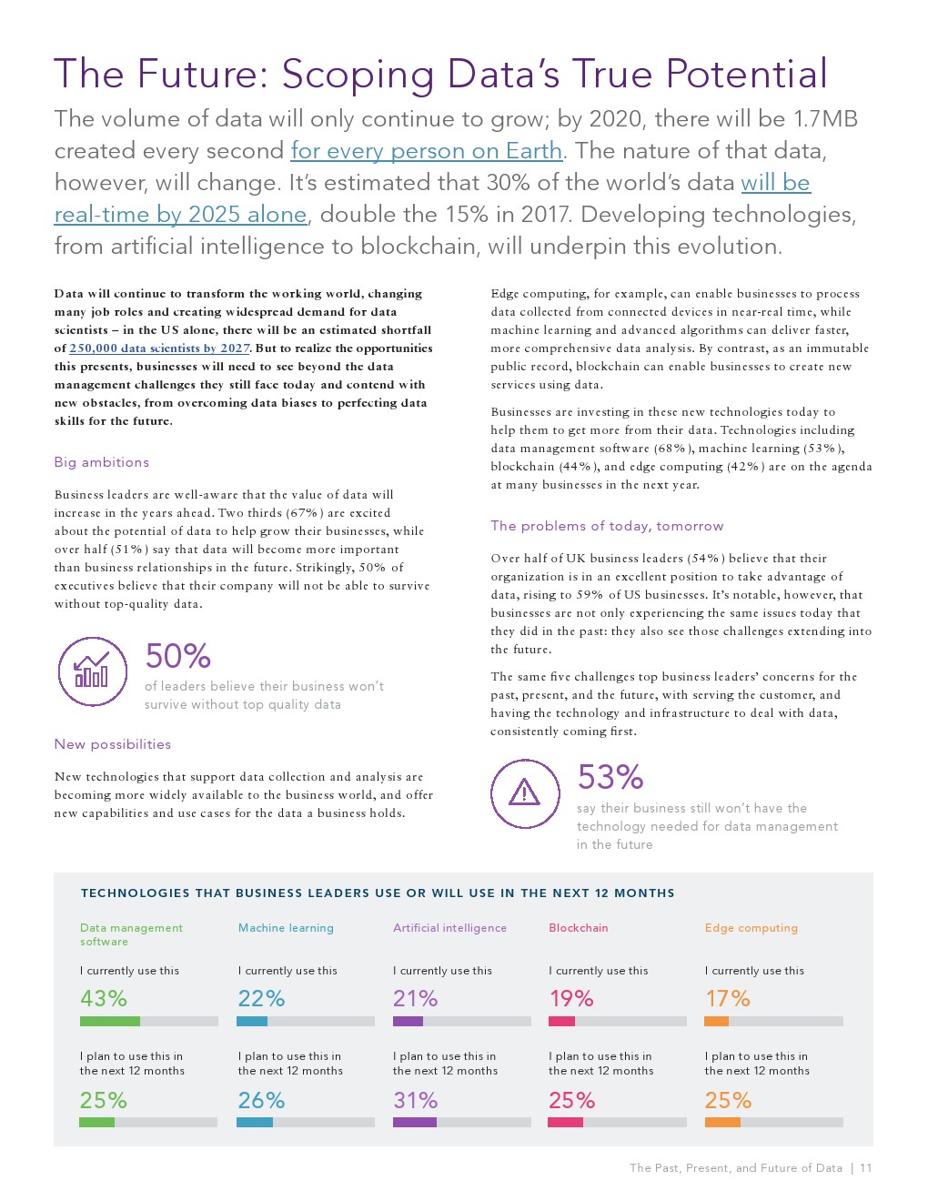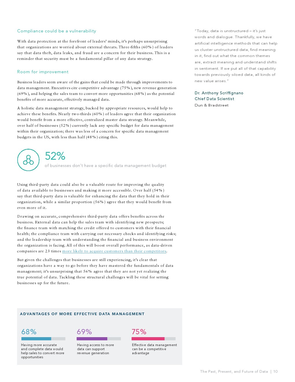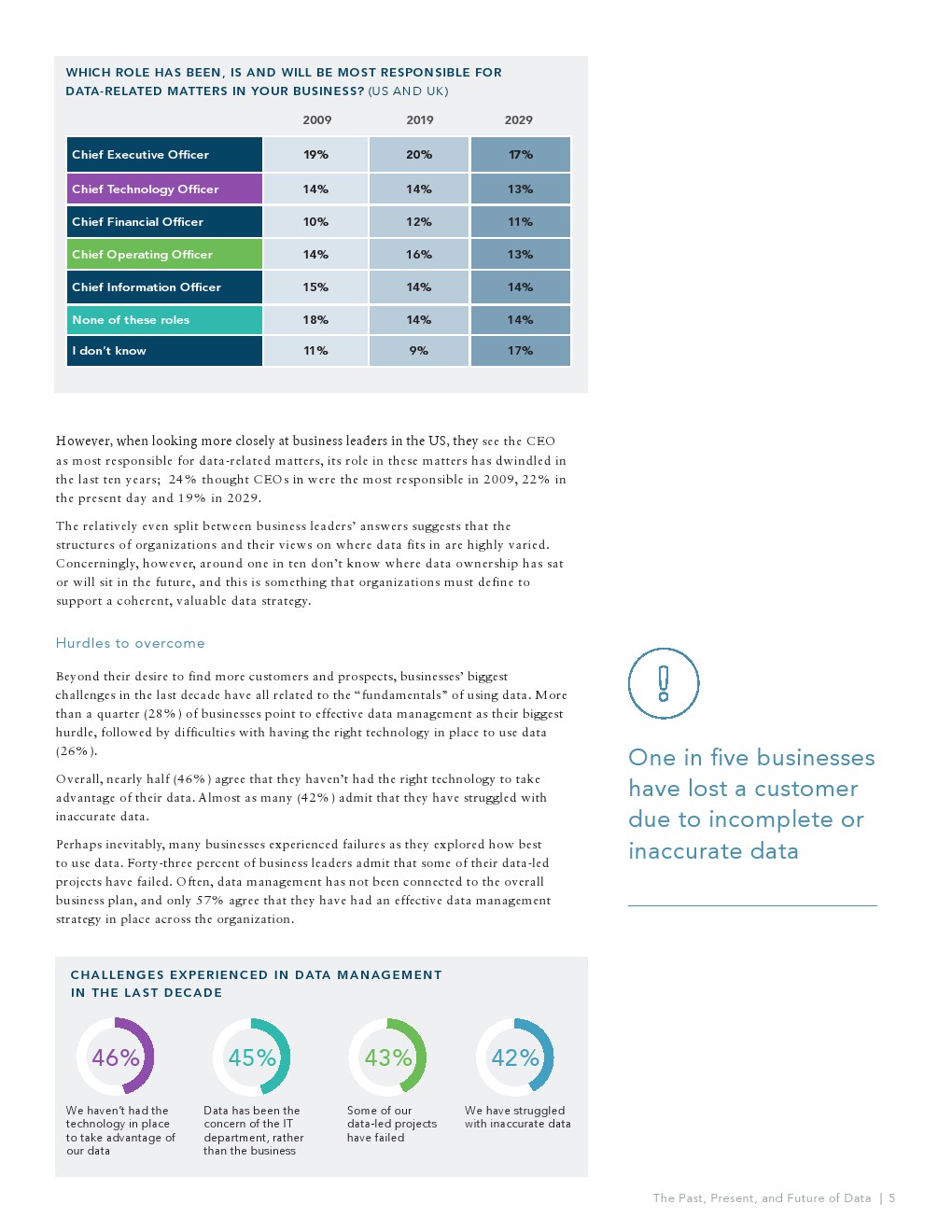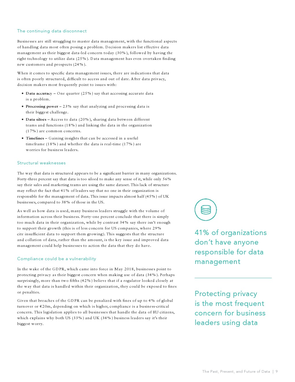 缺乏可识别的结构可能反映了这样一个事实,即4/10的企业在其组织中没有人负责数据管理。这种所有权的缺失也可能是因为52%的企业领袖说他们没有实施数据管理实践的预算。