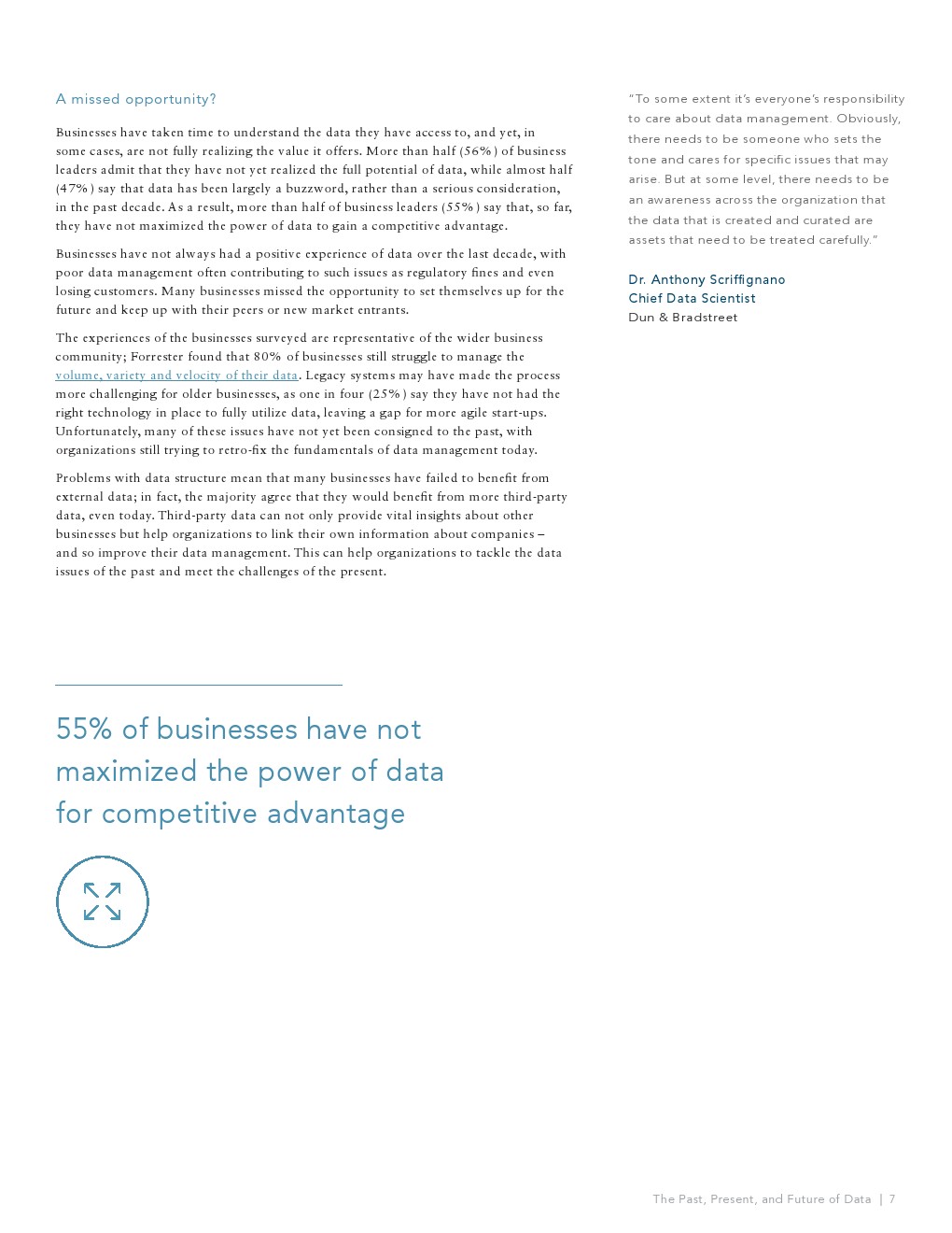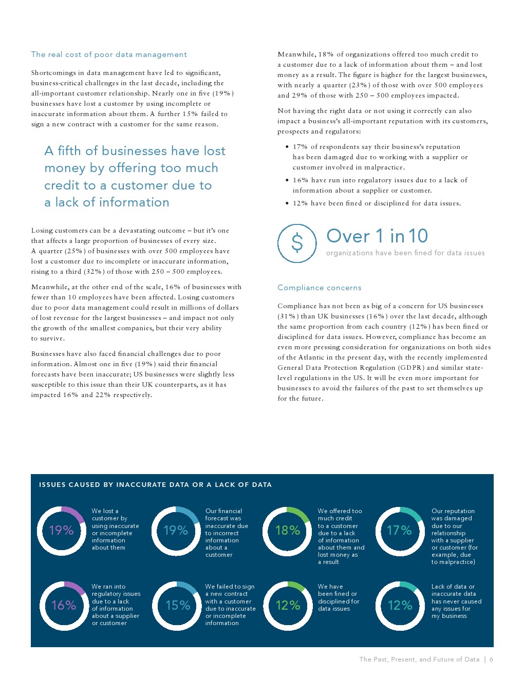 一项新的研究显示,美国和英国的企业正在亏损,因为它们未能在内部共享数据,或数据很糟糕。Dun和BradStreet的新报告“数据的过去、现在和未来”调查了500多名美国和英国的商业决策者,近20%的企业因为信息不完整或不准确而失去过客户,另有15%的企业承认由于同样的原因他们没能与客户签订新的合同。近1/4的英国受访者(22%)表示,财务预测是不准确的,18%的美国和英国公司因为对客户的信息不完整而向他们提供了过多的信贷,结果导致亏损。