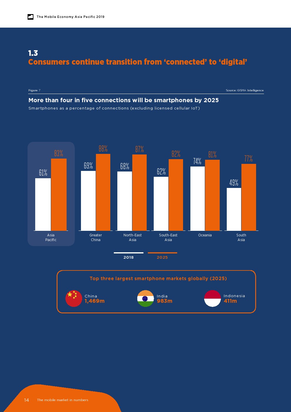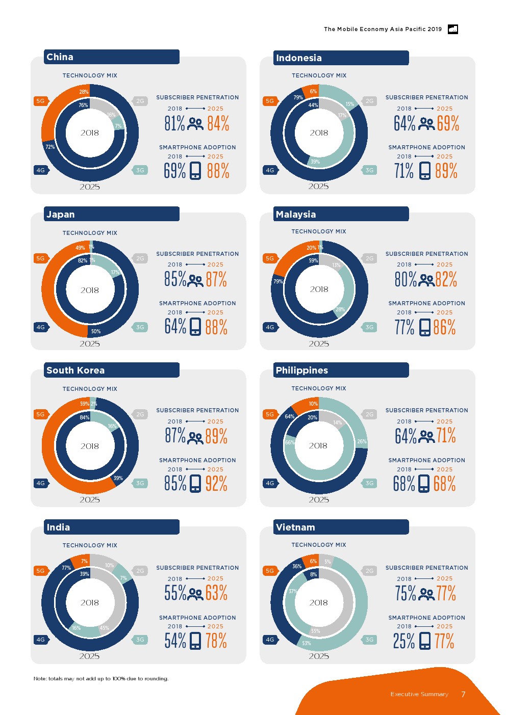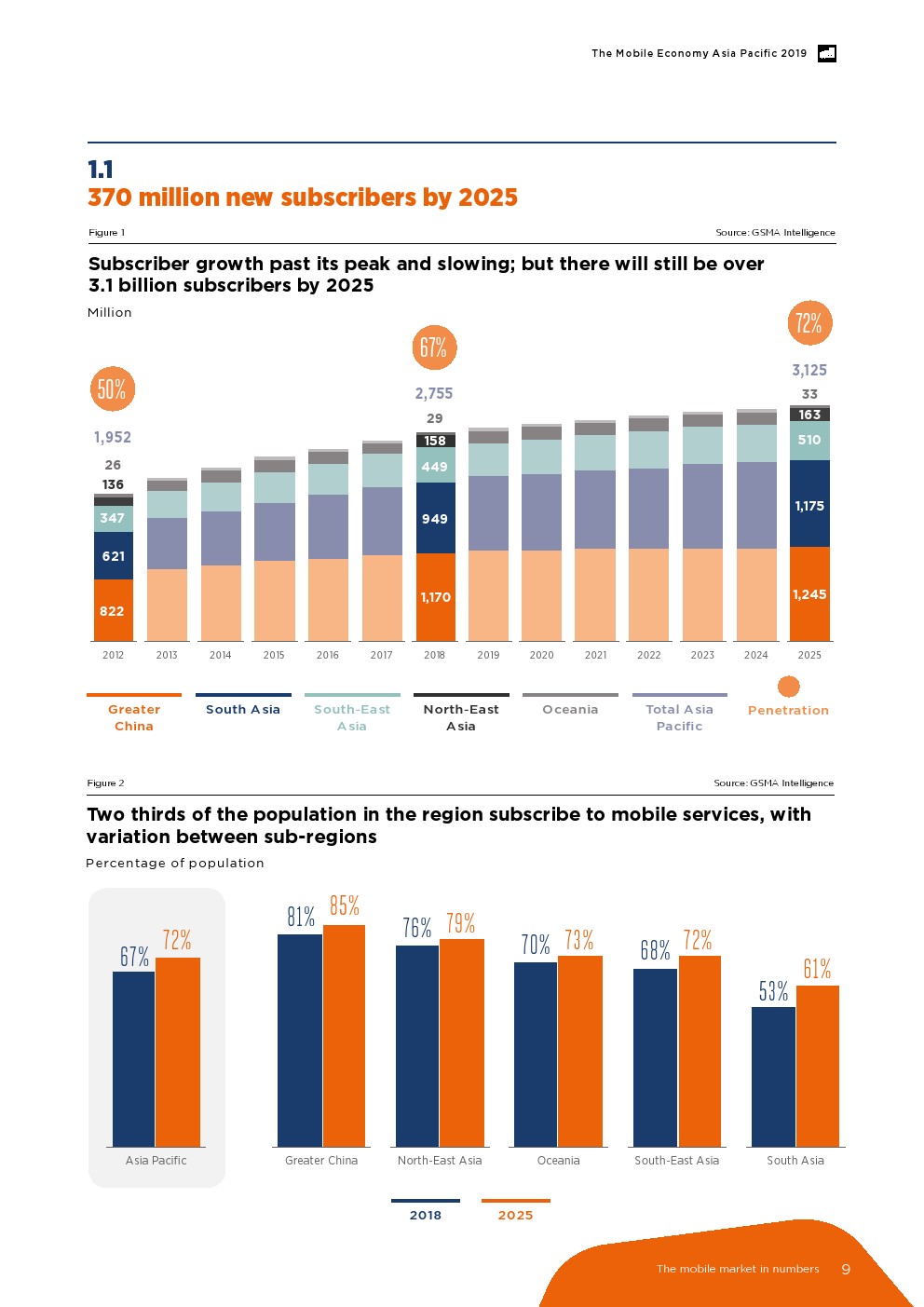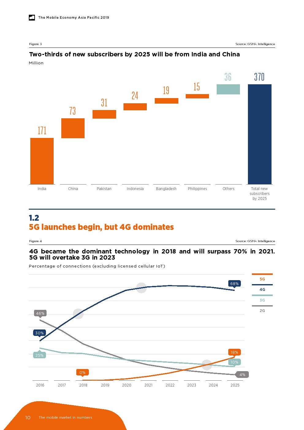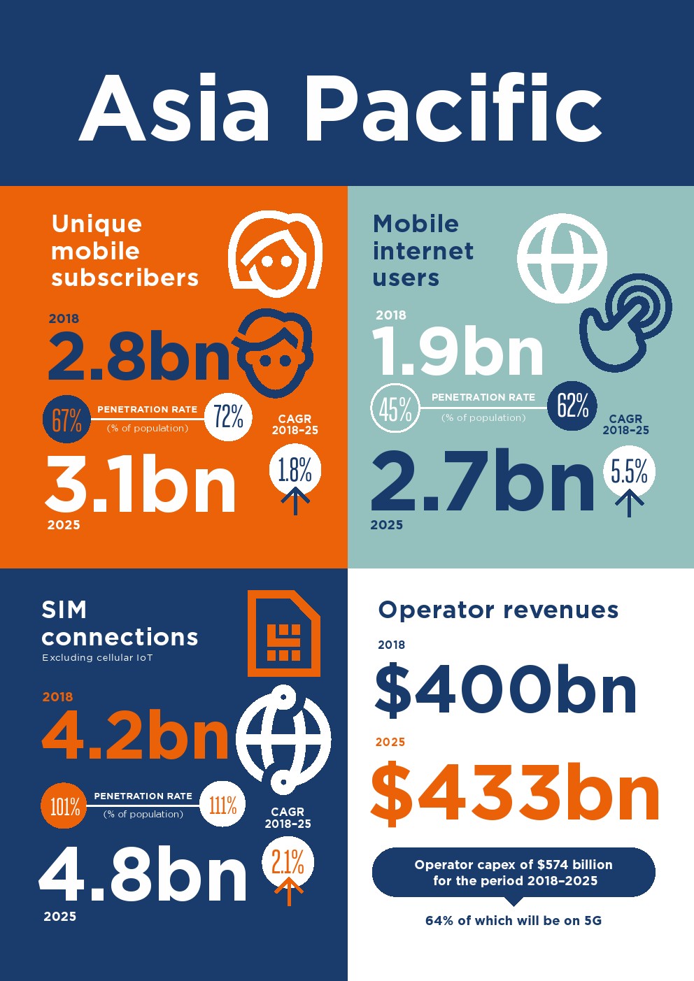 截至2018年底,亚太地区有28亿人订购了移动服务,占人口的67%。自2014年以来新增用户4.66亿(平均年增长率为4.7%)。全球超过一半的移动用户居住在亚太地区,主要是在中国和印度。到2025年,亚太地区将占全球新用户的一半以上。到目前为止,该地区将有3.7亿新用户,总数达到31亿,占人口的72%。这些新用户中约有90%来自六个国家:印度、中国、巴基斯坦、印度尼西亚、孟加拉国和菲律宾。