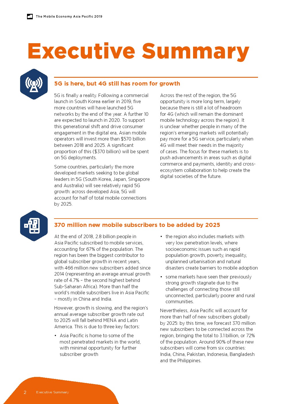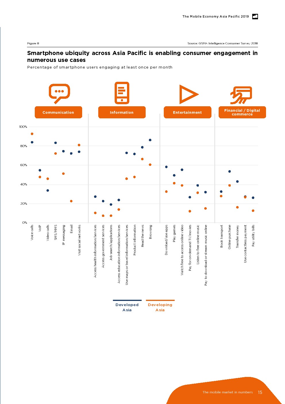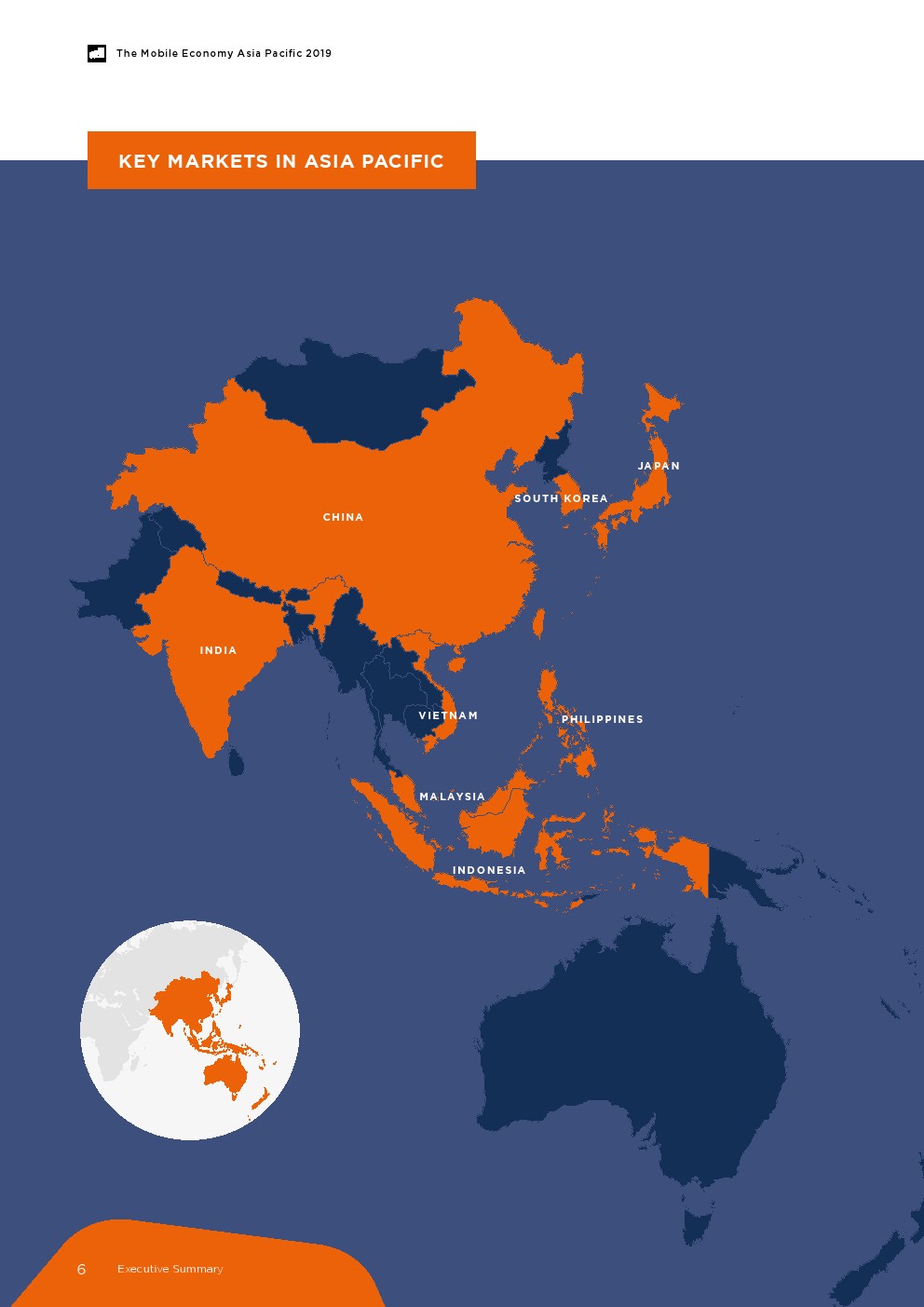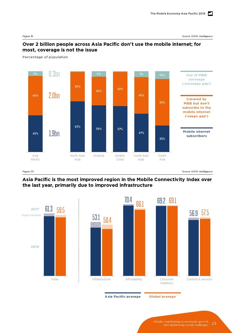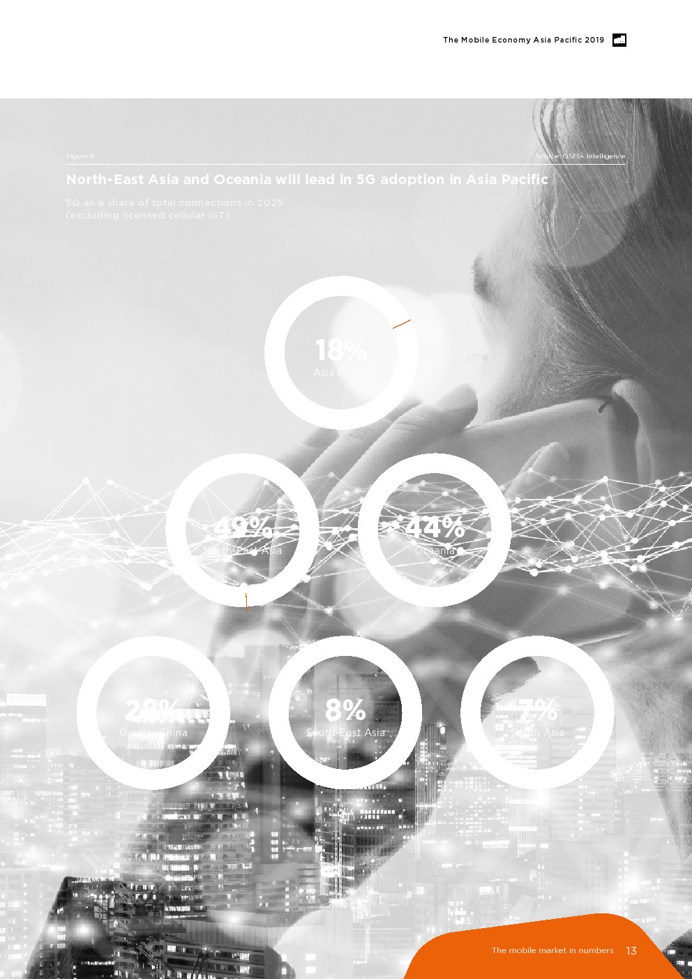 截至2018年底,亚太地区有28亿人订购了移动服务,占人口的67%。自2014年以来新增用户4.66亿(平均年增长率为4.7%)。全球超过一半的移动用户居住在亚太地区,主要是在中国和印度。到2025年,亚太地区将占全球新用户的一半以上。到目前为止,该地区将有3.7亿新用户,总数达到31亿,占人口的72%。这些新用户中约有90%来自六个国家:印度、中国、巴基斯坦、印度尼西亚、孟加拉国和菲律宾。