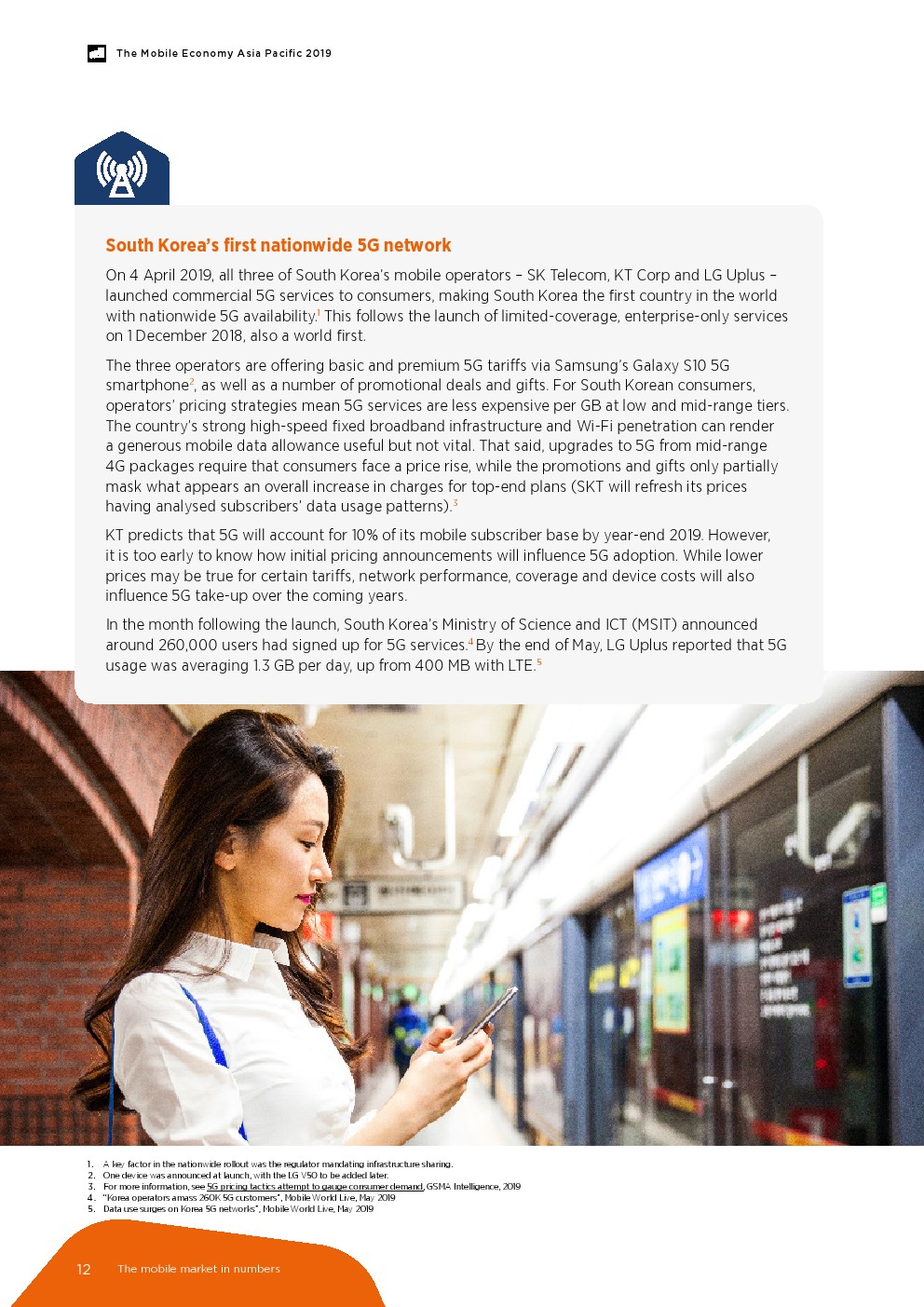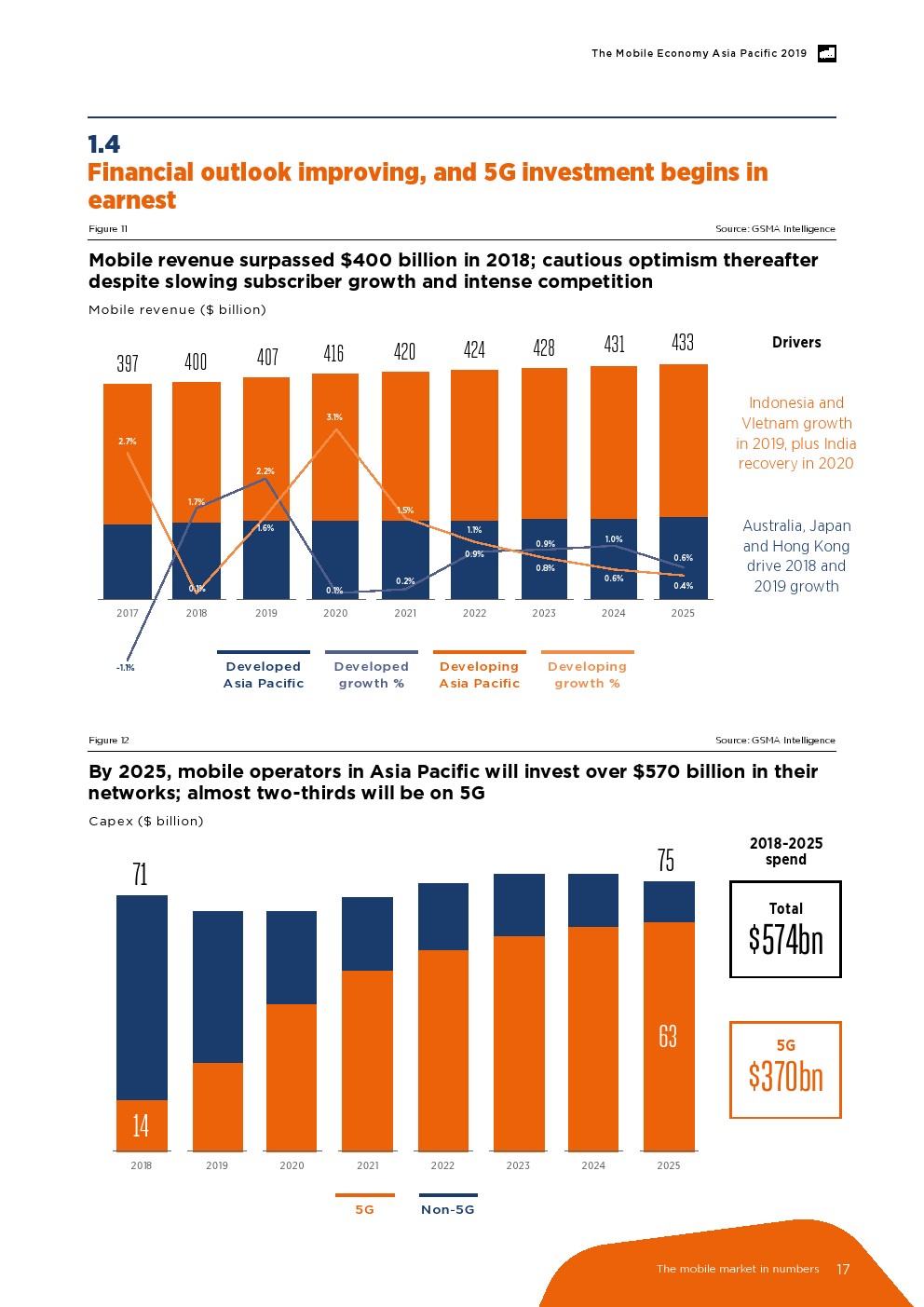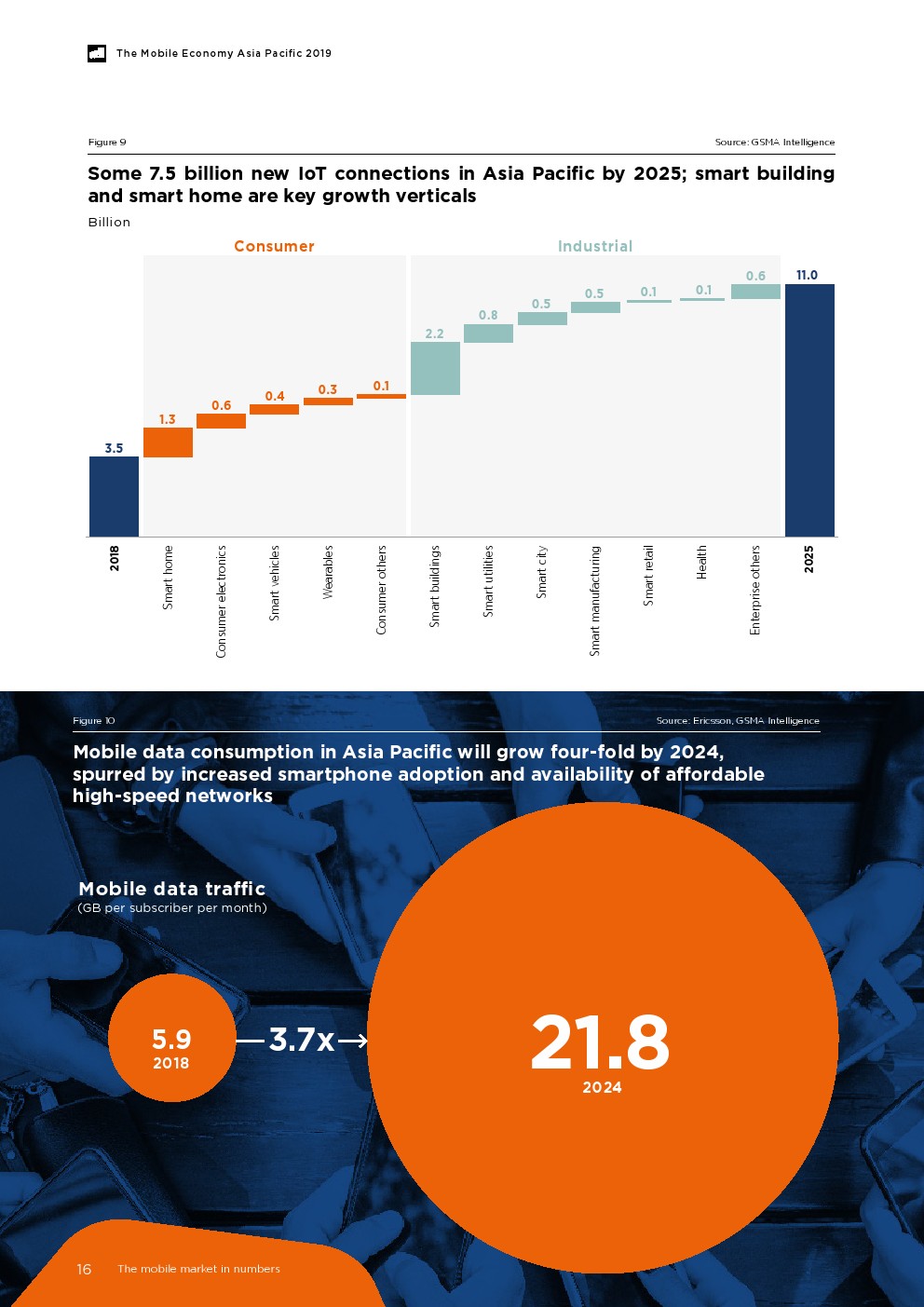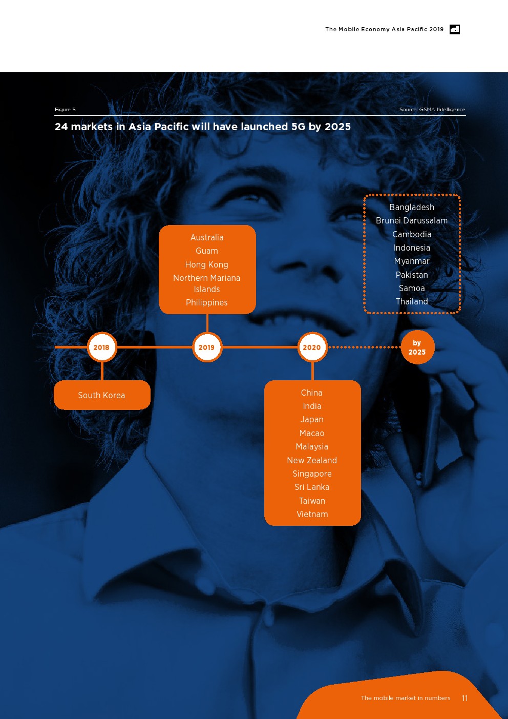 2019年早些时候在韩国进行商业发布之后,到今年年底还有五个国家将推出5G网络。另外10个国家预计将在2020年推出。为了支持5G,亚洲移动运营商将在2018-2025年投资超过5700亿美元。其中很大一部分(3700亿美元)将用于在5G部署。韩国、日本、新加坡和澳大利亚的5G增长更快,到2025年,5G将占其移动连接总数的一半。