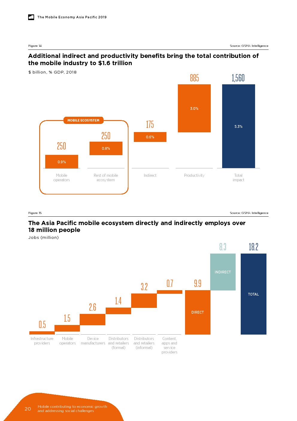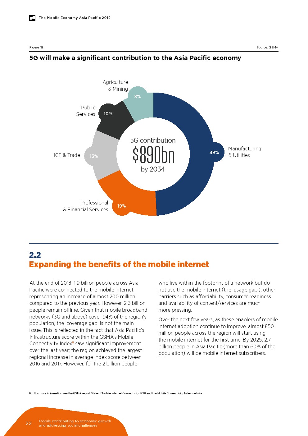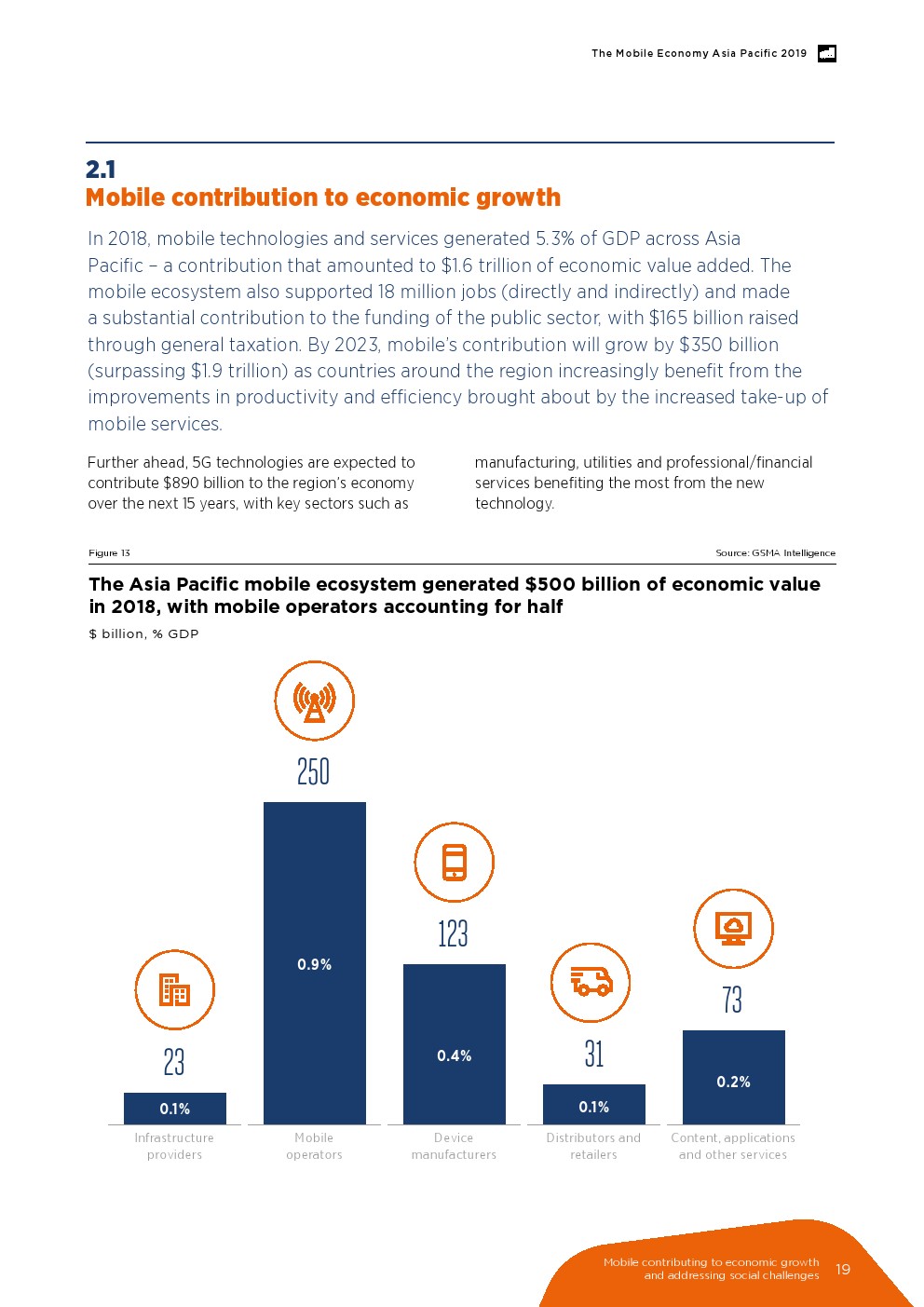 移动继续为整个地区的社会经济发展做出重大贡献。 2018年,亚太地区的移动技术和服务产生了1.6万亿美元的经济价值(占GDP的5.3%)。到2023年,这一贡献将超过1.9万亿美元。未来15年,5G技术将为该地区的经济贡献近9000亿美元。