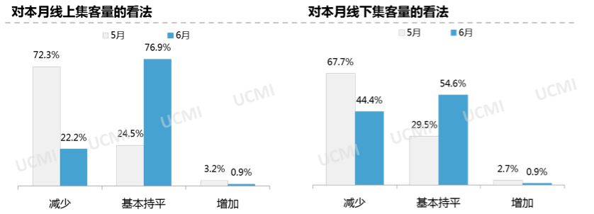 调查显示,6月份线上集客量减少。其中认为线上集客量“增加”的经销商比例仅为0.9%,“减少”的比例为22.2%;认为线下集客量“增加”的经销商比例为0.9%,“持平”的比例为54.6%,“减少”的比例为44.4%。