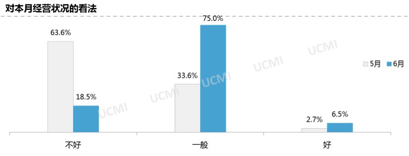 调查显示,经销商认为6月份的经营状况一般,认为经营状况“一般”的比例为75.0%,认为“好”的比例仅为6.5%,认为“不好”的经销商比例升至18.5%。