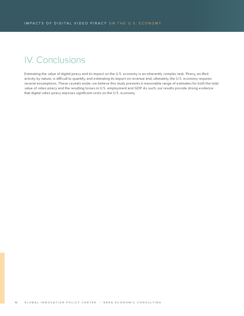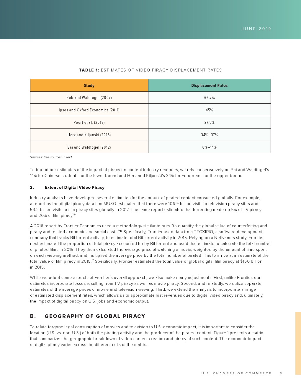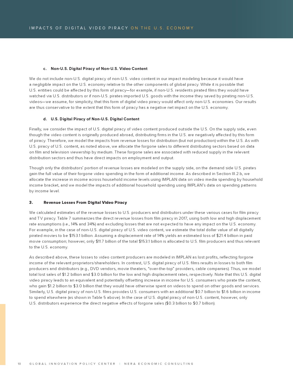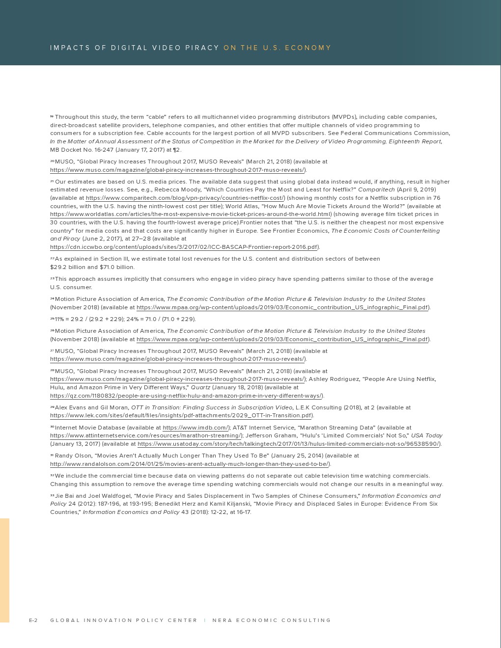 NERA定义的版权基于一系列盗版内容比例的估计。如果这些内容不是通过盗版行为获得的,用户就会支付费用。基于先前的研究,NERA的下限估计假设位移率为14%,上限估计假设位移率为34%。