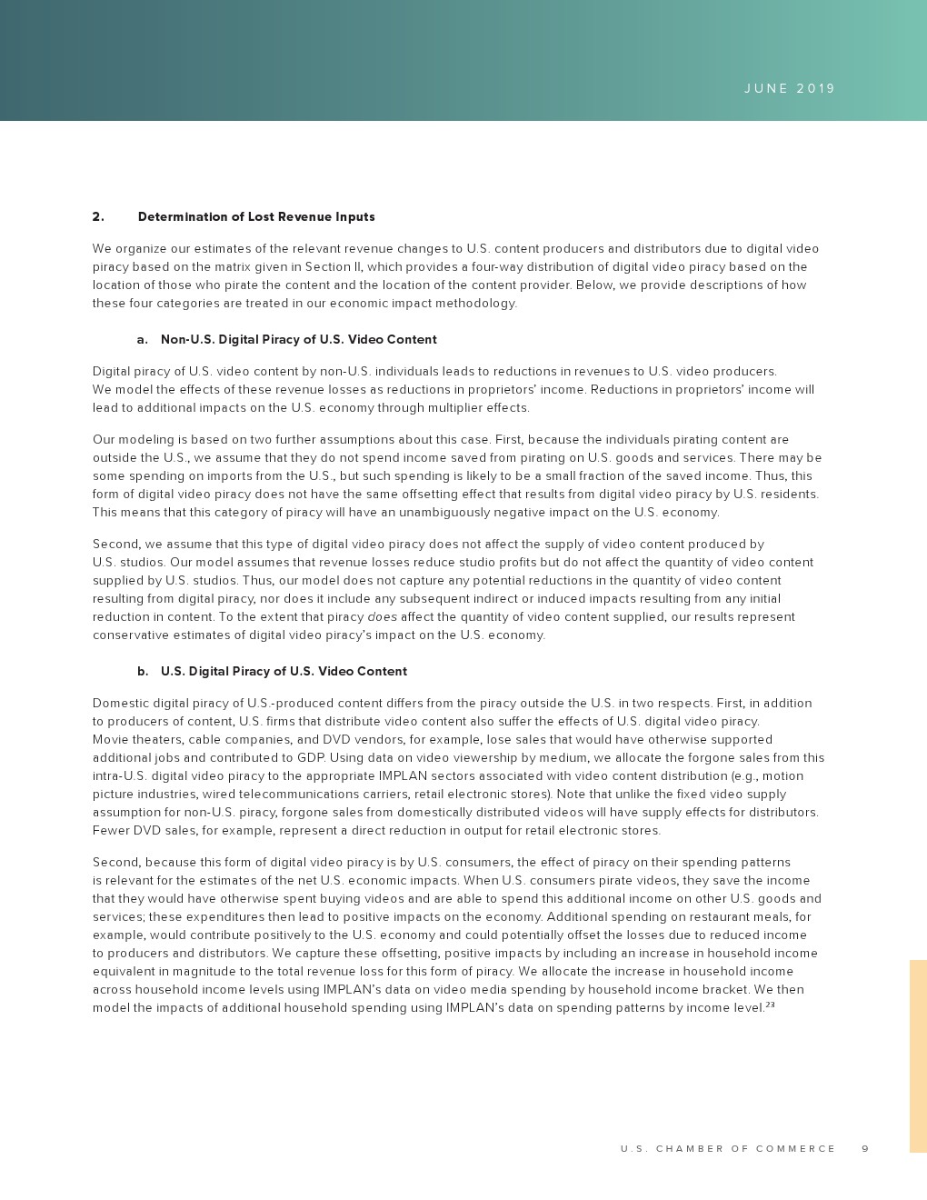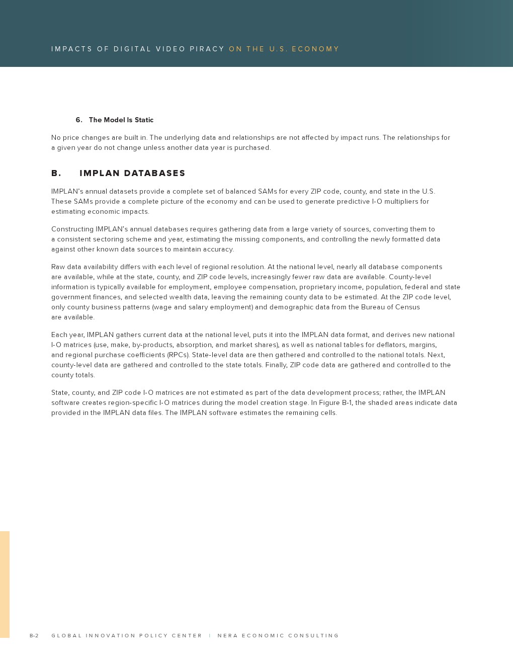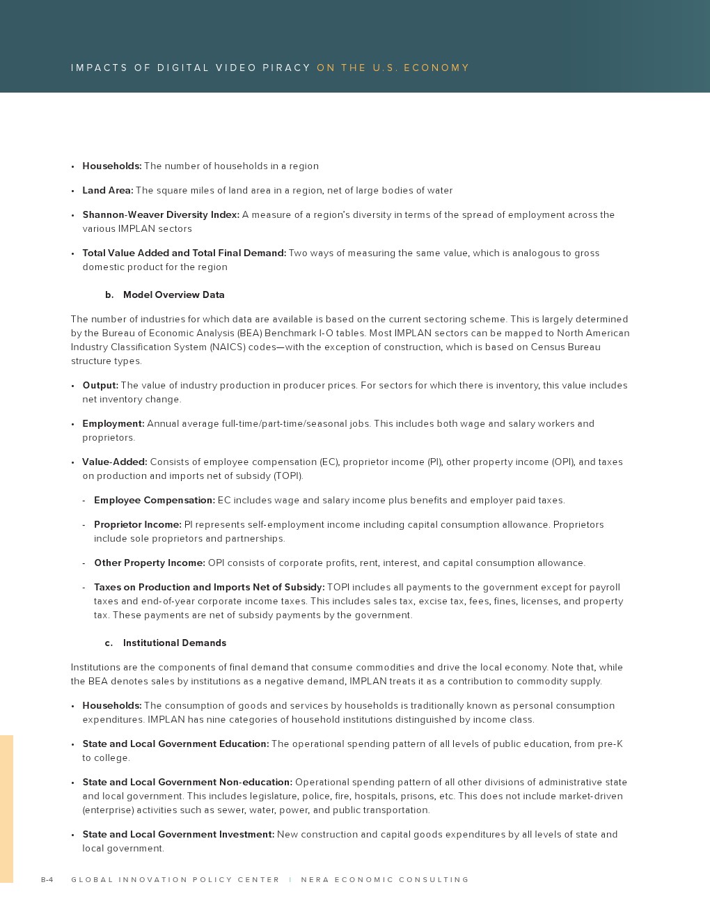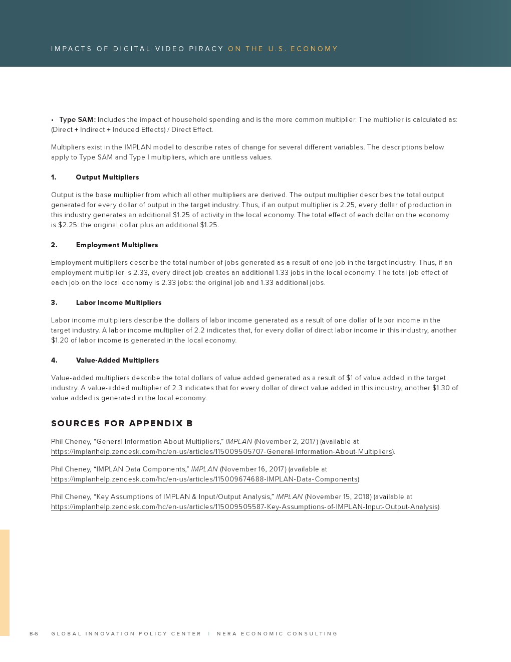 NERA利用一个成熟的国家宏观经济模型(IMPLAN)来评估网络视频盗版对美国经济的总体影响,并评估了网络视频盗版对美国生产商和其他国家带来的潜在收入损失。这是根据对网络盗版电影和电视节目的数量、盗版内容的市场价值,以及盗版网络视频内容在不存在盗版行为的情况下购买和支付的估计计算得出的。其建模方法可以估算出美国经济中的盗版净效应,包括直接,间接和诱导效应。
