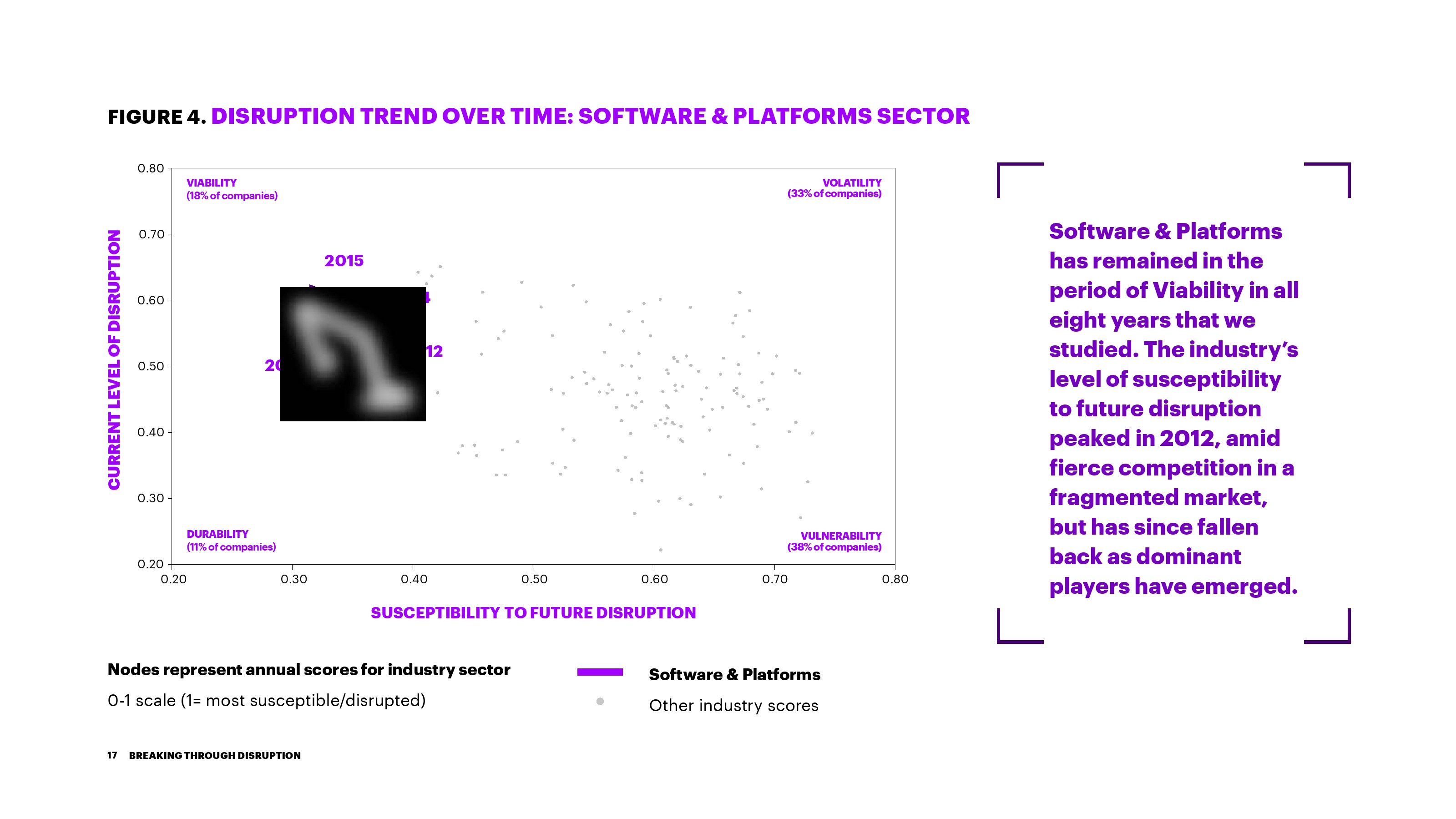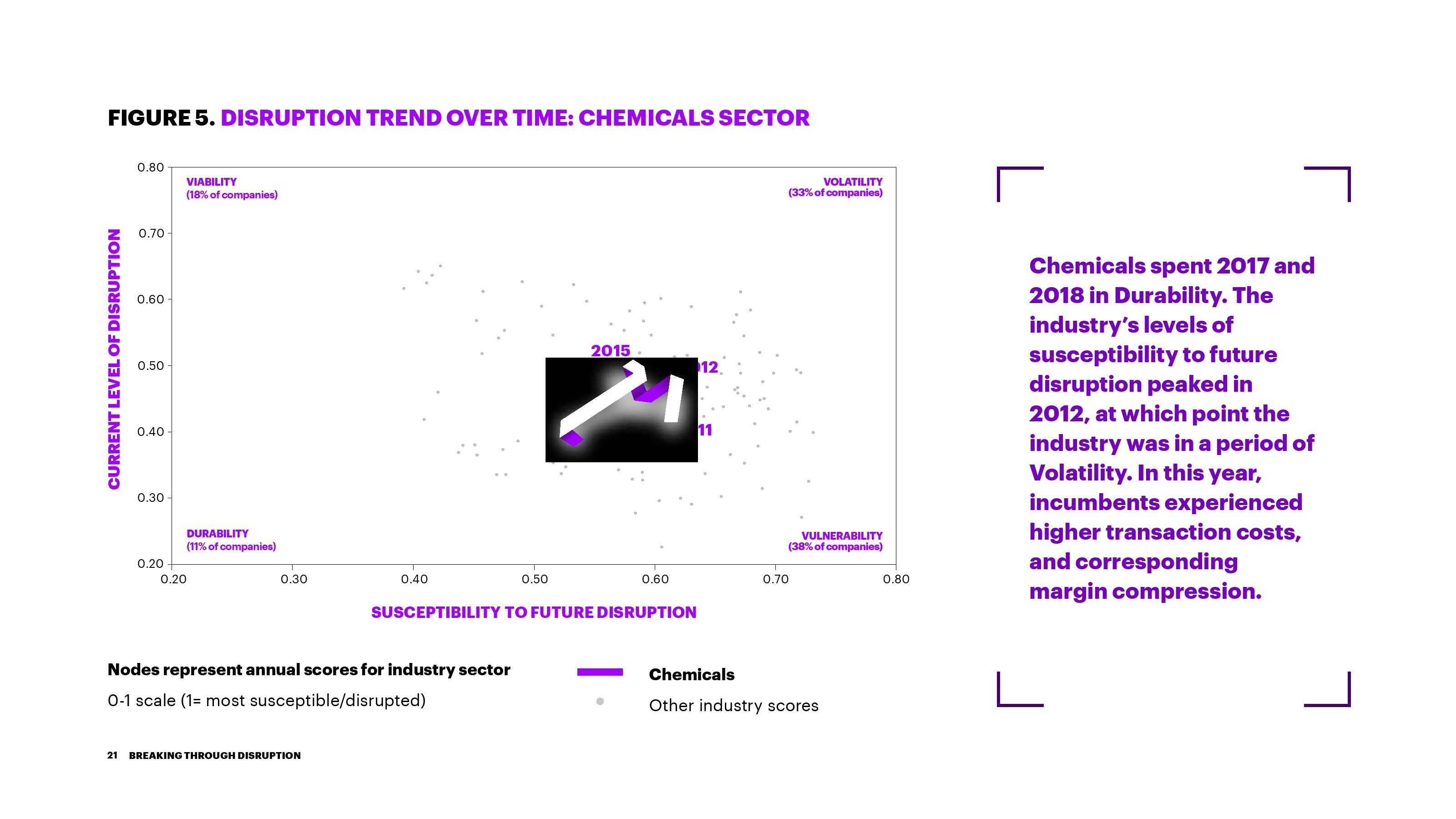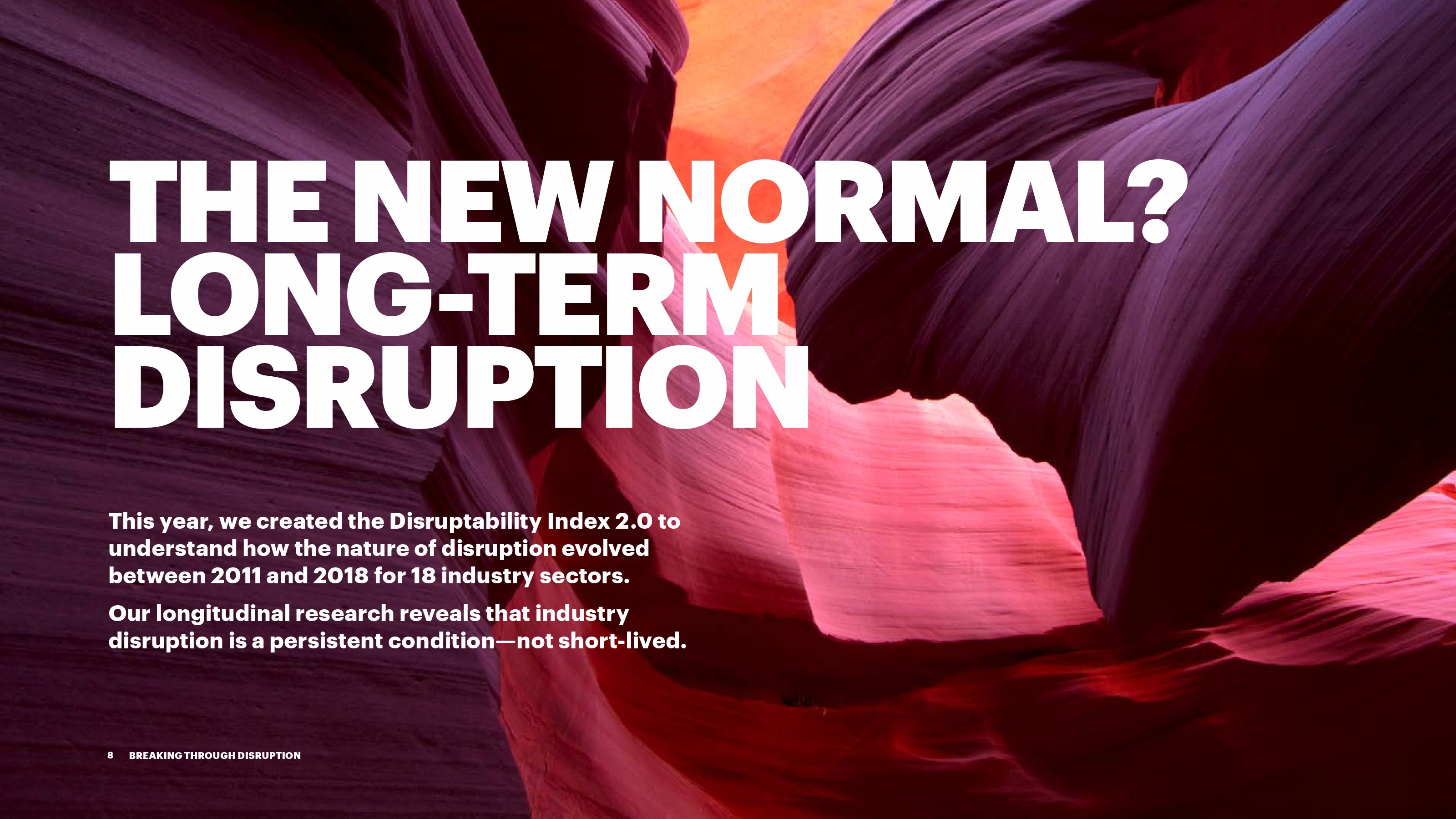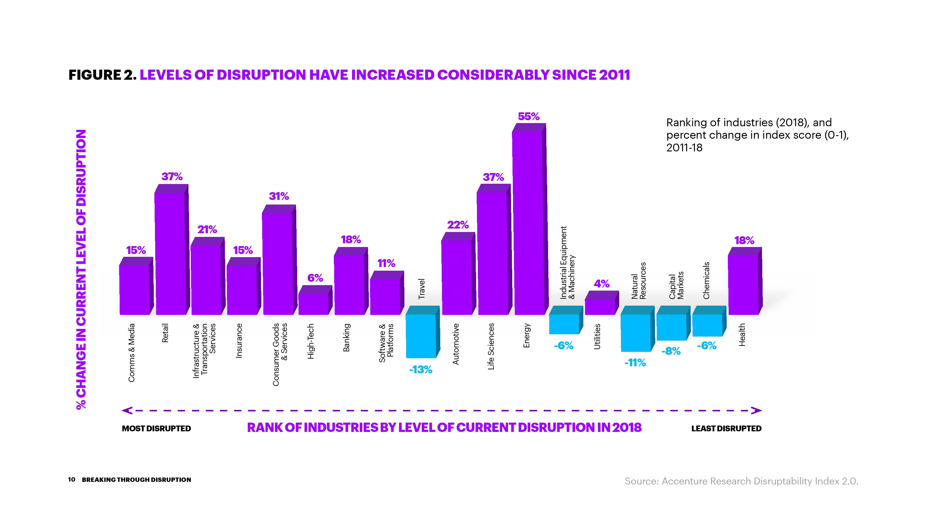 颠覆是持续的,而不是中断的。2011-2018年间,超过1/4的行业(83%)在相同的颠覆期至少花费了五年时间。此外,报告还发现,行业参与者意识到了颠覆带来的威胁,并且所有18个行业都增强了对颠覆的适应能力。