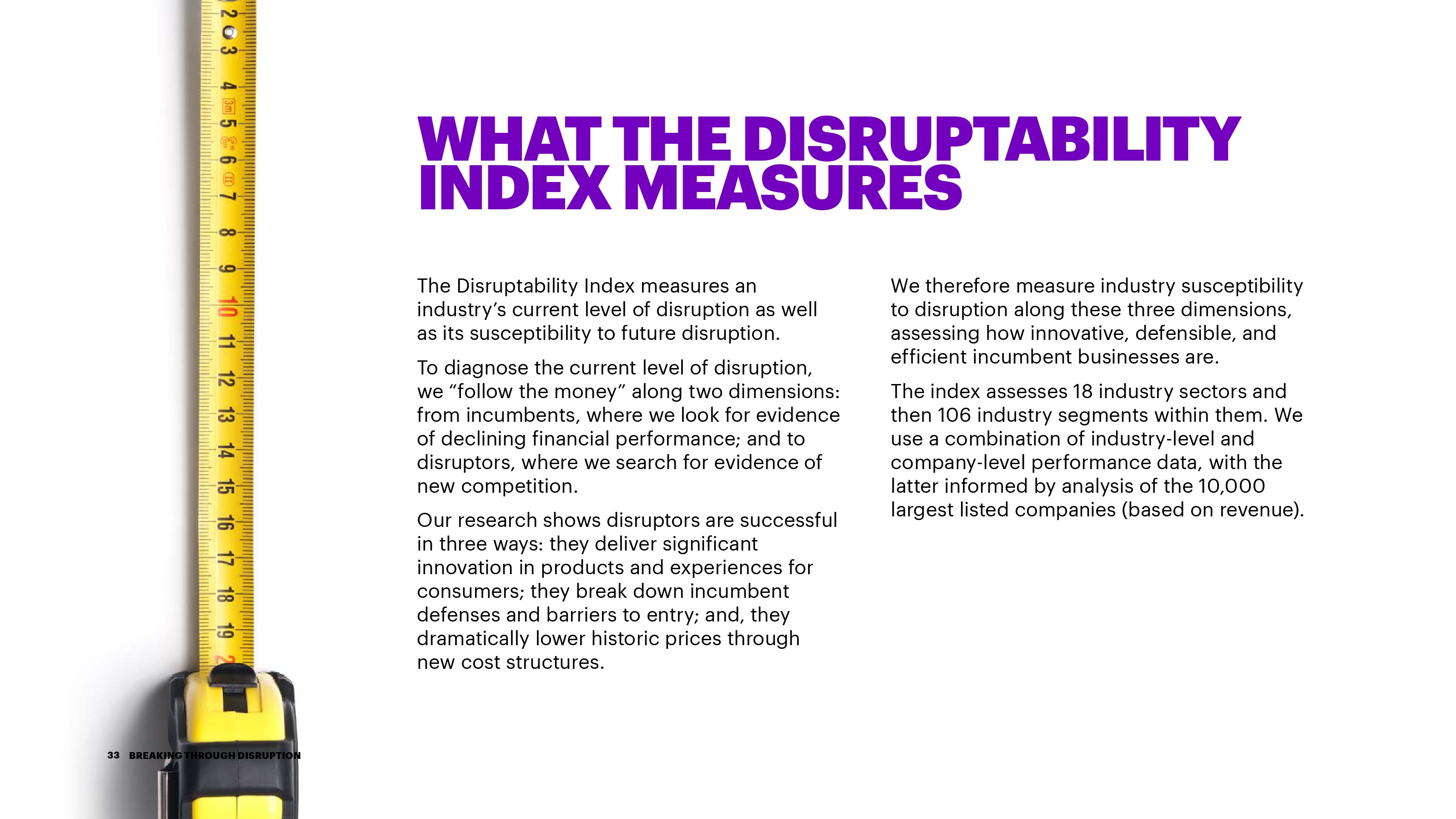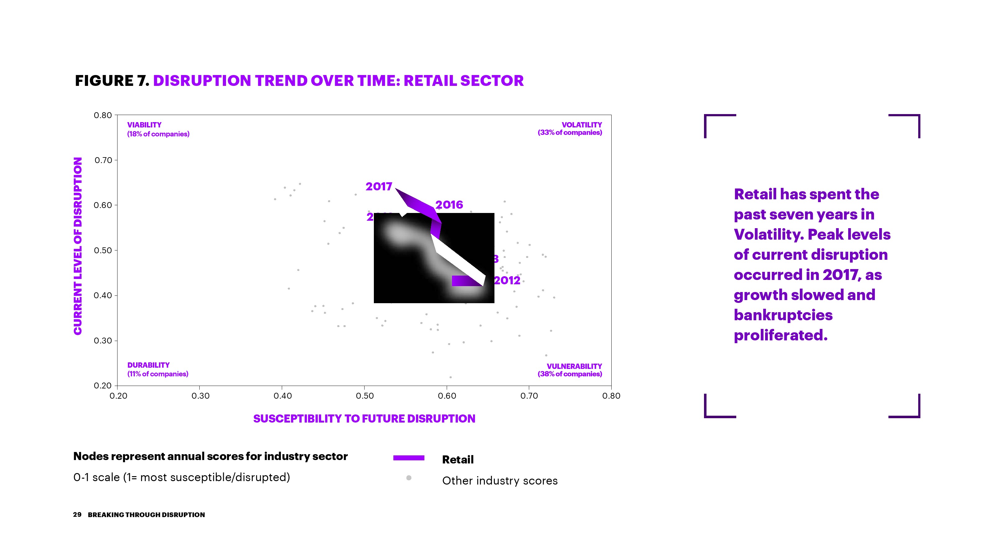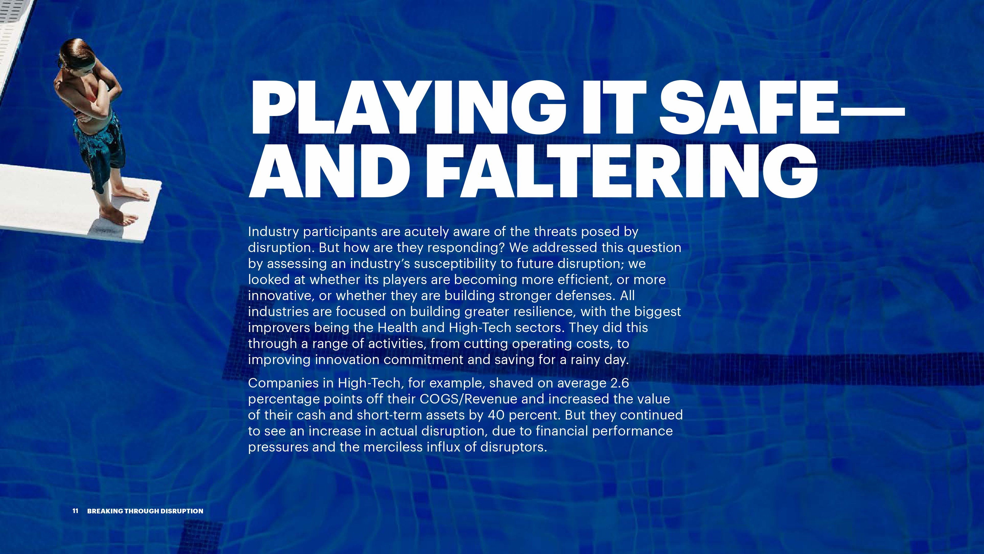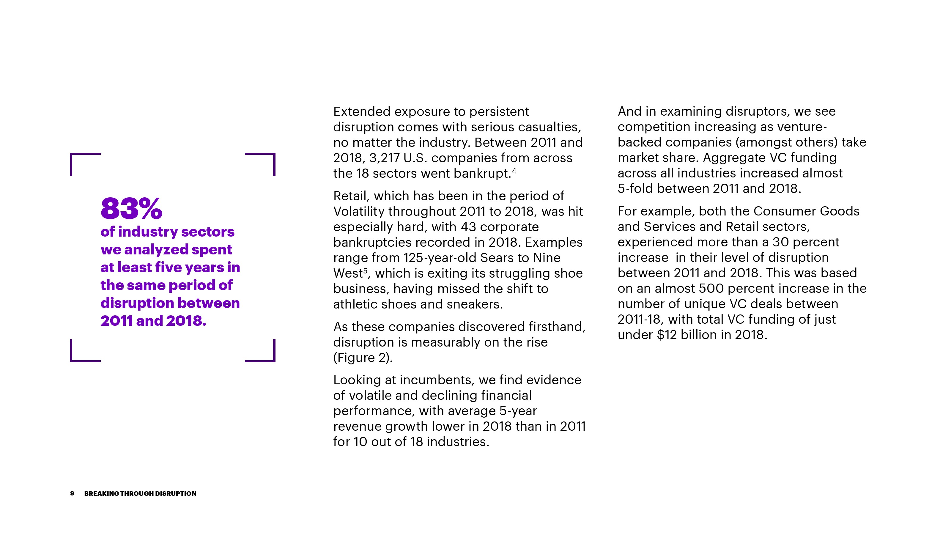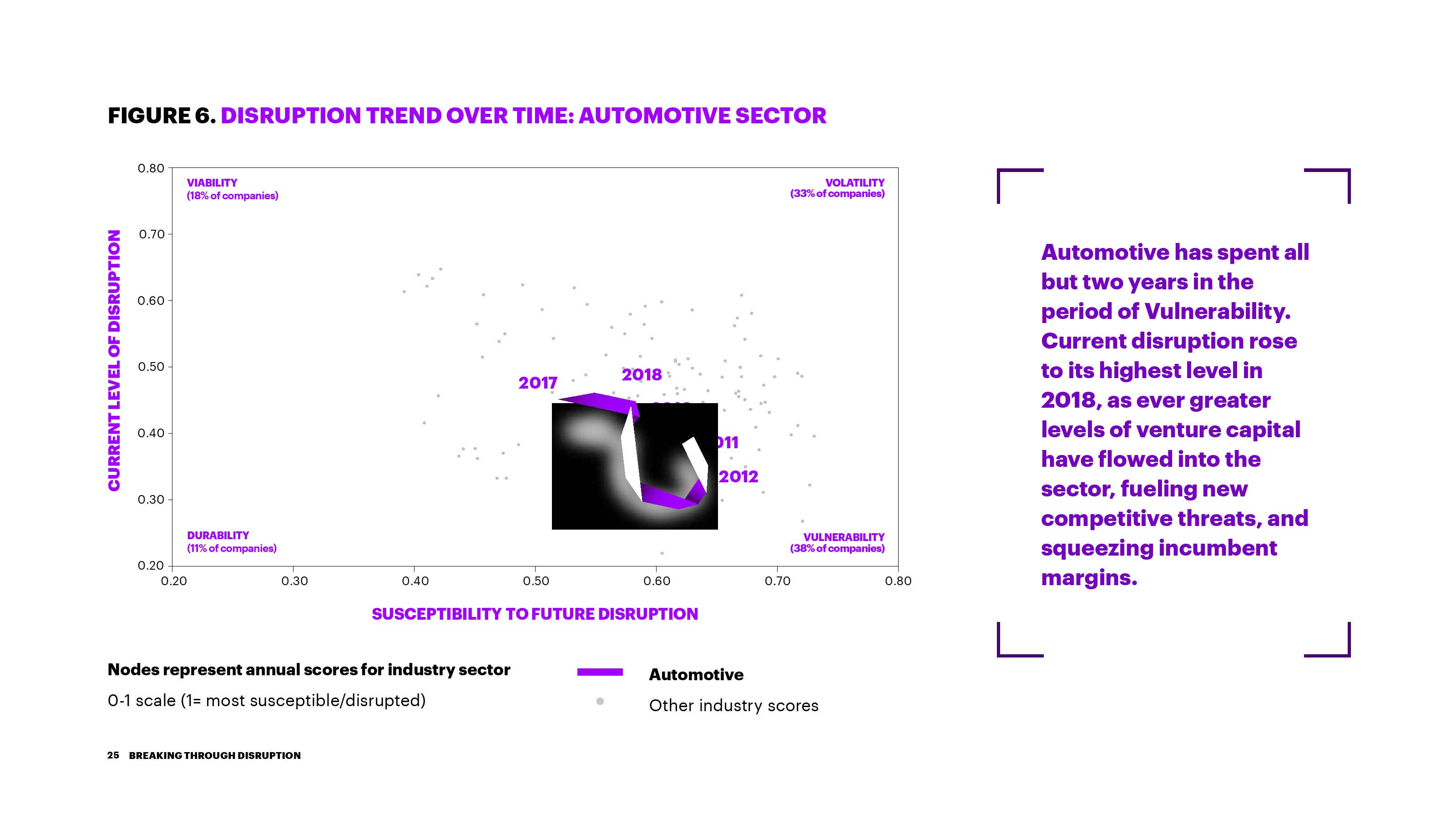 颠覆是持续的,而不是中断的。2011-2018年间,超过1/4的行业(83%)在相同的颠覆期至少花费了五年时间。此外,报告还发现,行业参与者意识到了颠覆带来的威胁,并且所有18个行业都增强了对颠覆的适应能力。