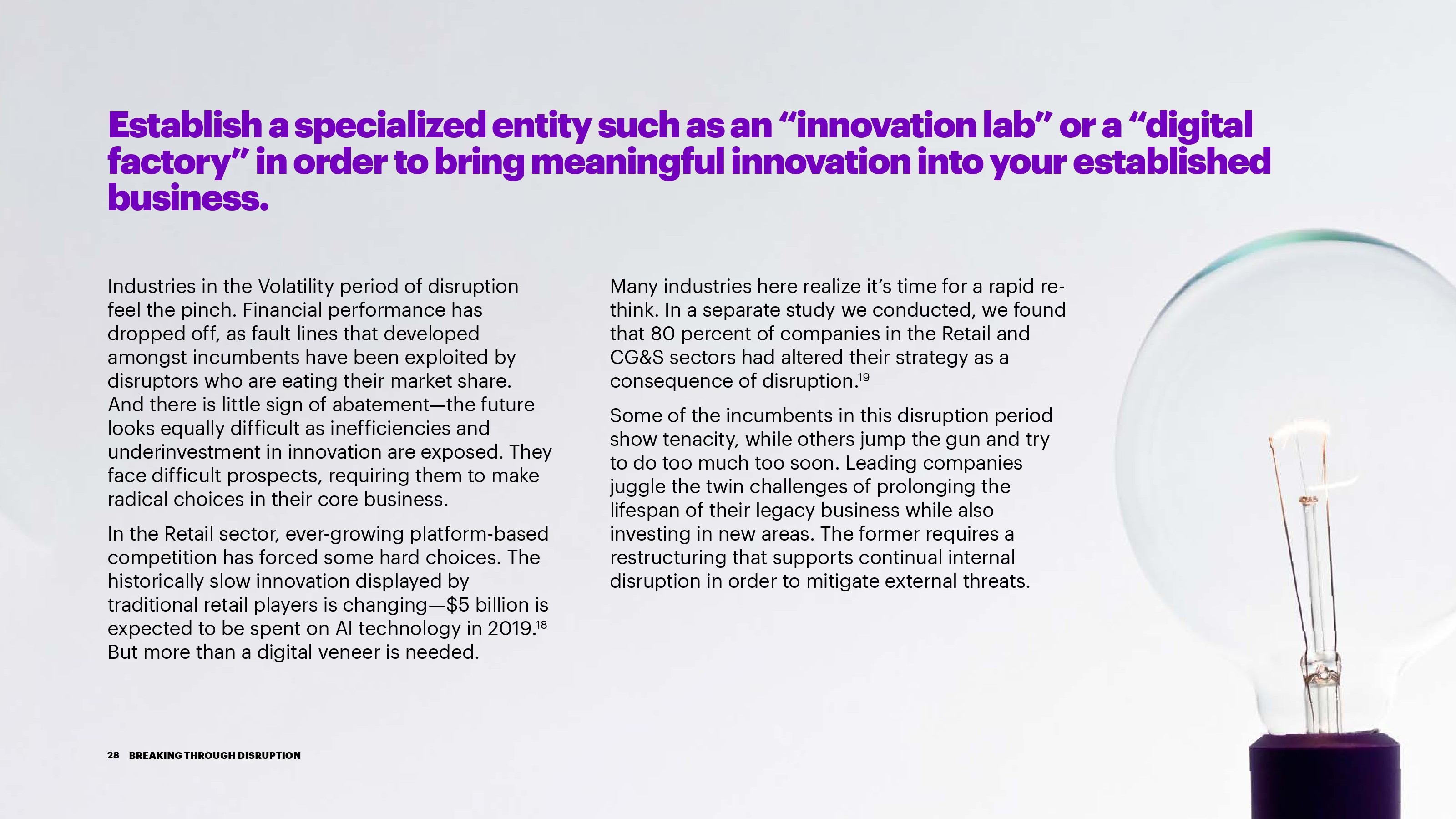 - 从内部颠覆。建立一个专门的实体,如“创新实验室”或“数字工厂”,以便为现有业务带来有意义的创新。
