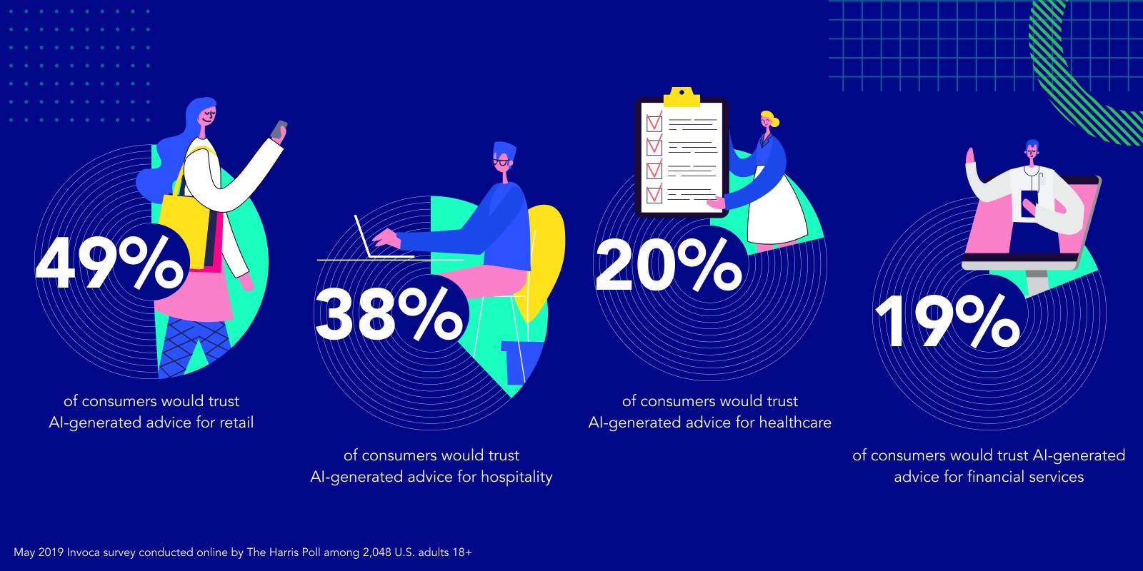 从行业层面来看:近一半的消费者(49%)信任AI生成的零售建议,38%的消费者信任AI生成的酒店建议,只有20%的消费者信任AI生成的医疗建议,19%相信金融服务建议。