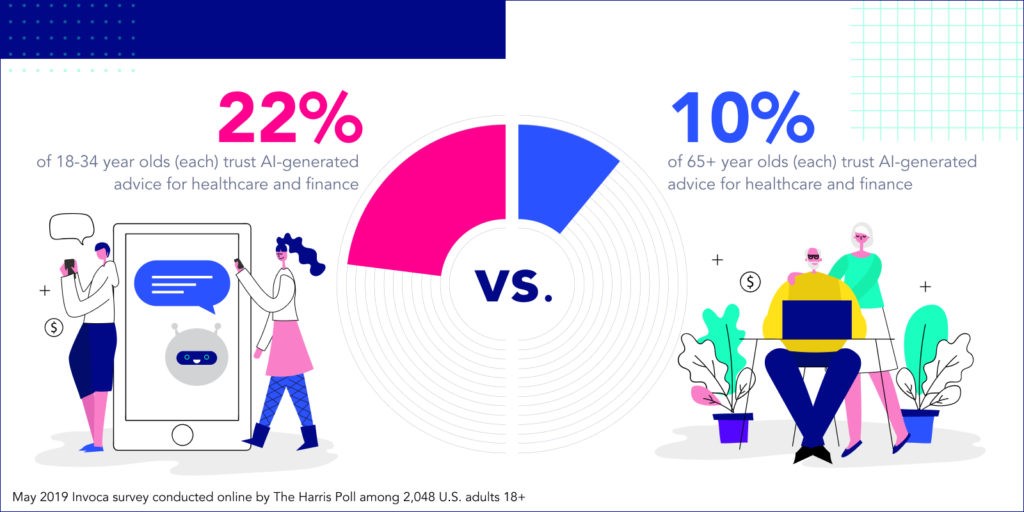 从代际的角度来看,年轻的消费者更有可能信任人工智能生成的建议(80%的18-34岁 vs. 62%的35岁以上消费者),尤其是在金融服务和医疗保健方面。18-34岁的受访者中有22%信任AI提供的医疗保健和金融方面的建议,而65岁以上的受访者中只有10%信任AI生成的建议。