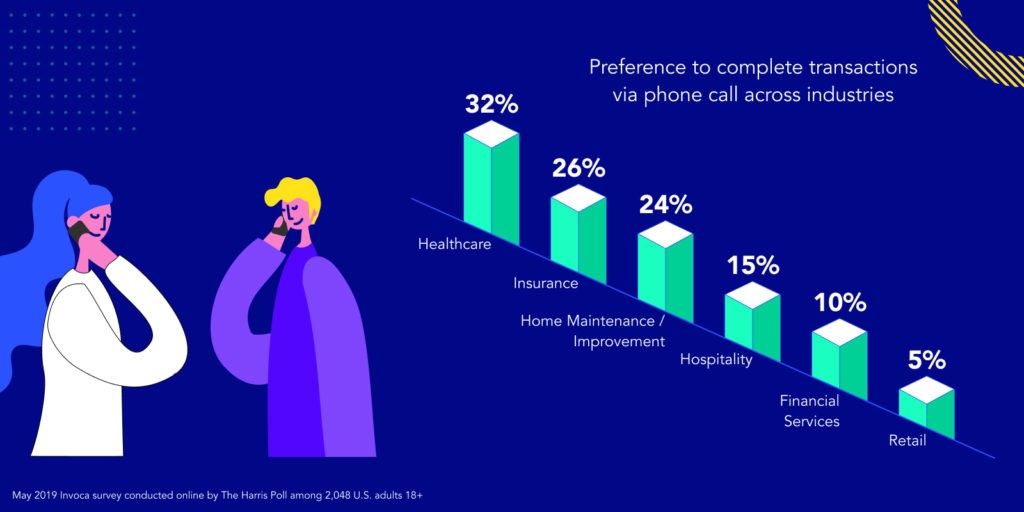 解决问题、建立信任或完成购买的能是至关重要的。例如,在医疗保健领域,32%的消费者通过电话完成交易,30%的消费者喜欢面对面交易,25%的消费者喜欢在线交易,6%的消费者通过品牌的移动应用完成交易,5%的消费者通过聊天机器人等人工智能完成交易。