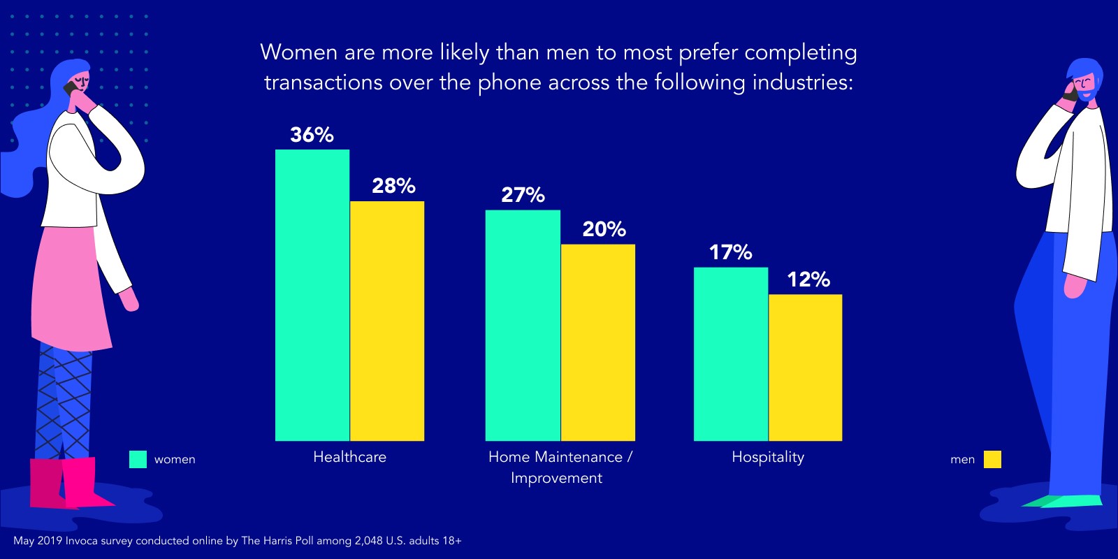 女性在医疗保健(36% vs. 28%)、家庭维护/改善(27% vs. 20%)和酒店(17% vs. 12%)方面比男性更倾向于通过电话完成交易。
