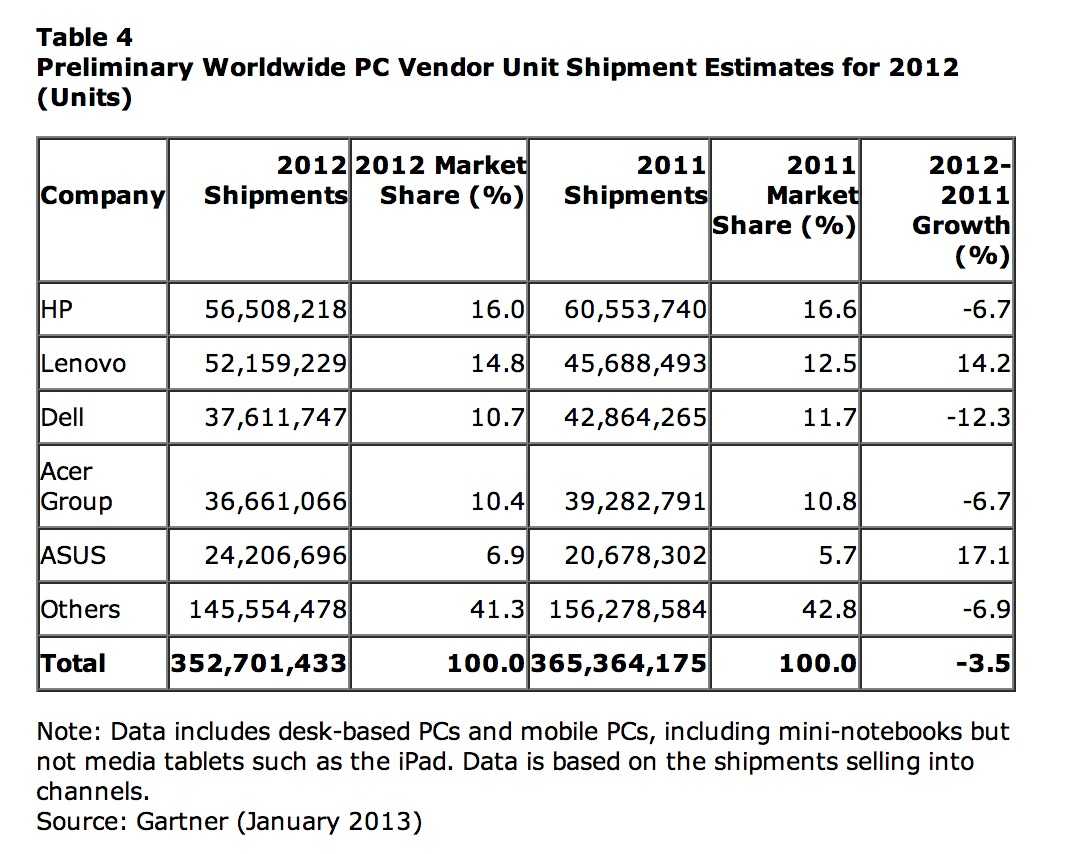 Gartner 14 日發佈了最新全球 PC 出貨量數據,根據調查 2012 全球 PC 出貨量來到 9030 萬台;第四季度 PC 出貨量較去年同期小幅下滑 4.9%,分析師研判主因係受到經濟疲軟所致。