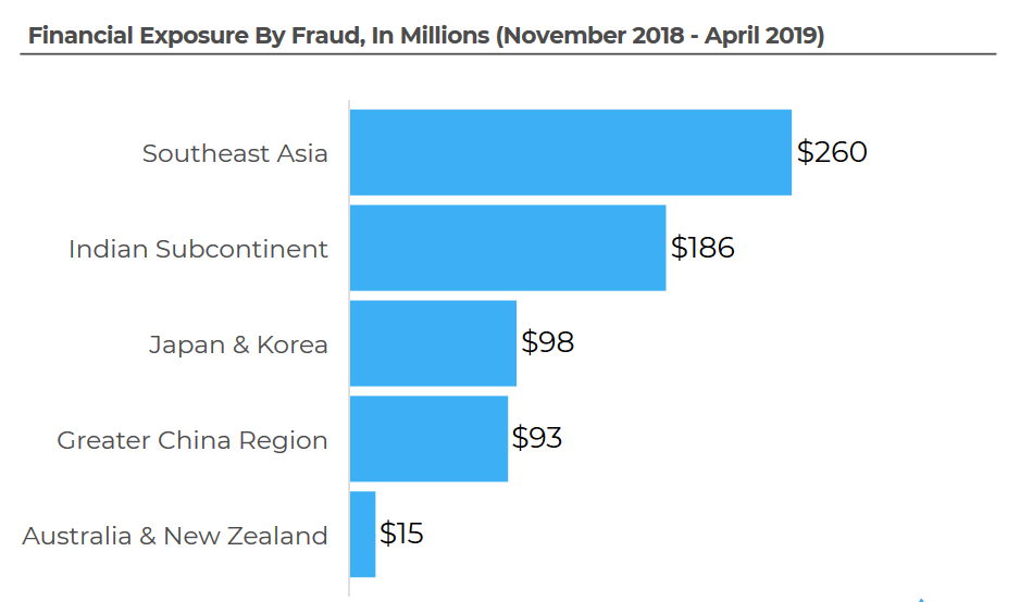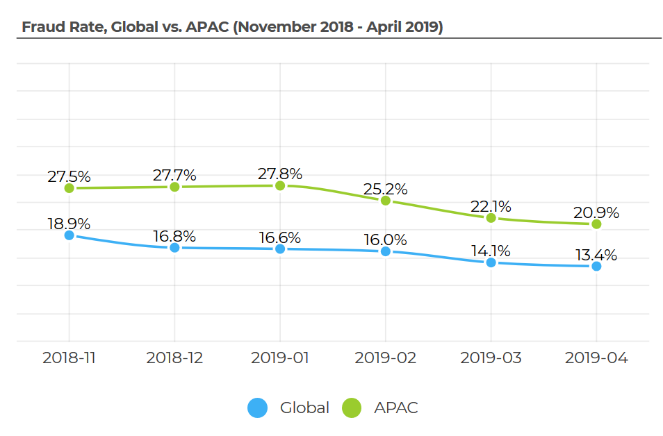 从2018年11月到2019年4月,亚太地区的平均欺诈率约为25%,比全球平均水平高60%。