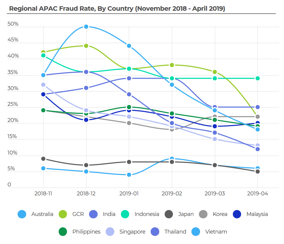 2018年11月到12月之间越南的欺诈率跃升了42%,达到了50%。除了澳大利亚和韩国分别在2月和3月的小幅上涨外,所有其他国家的欺诈率都相对稳定,有些甚至在第一季末有所下降。