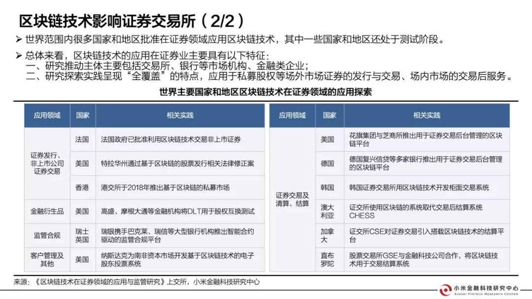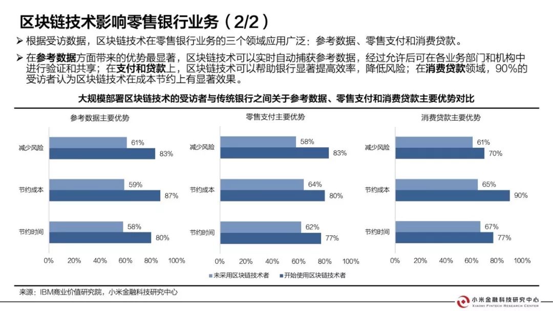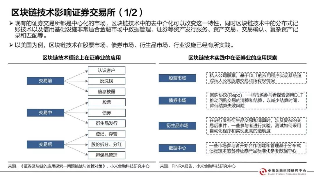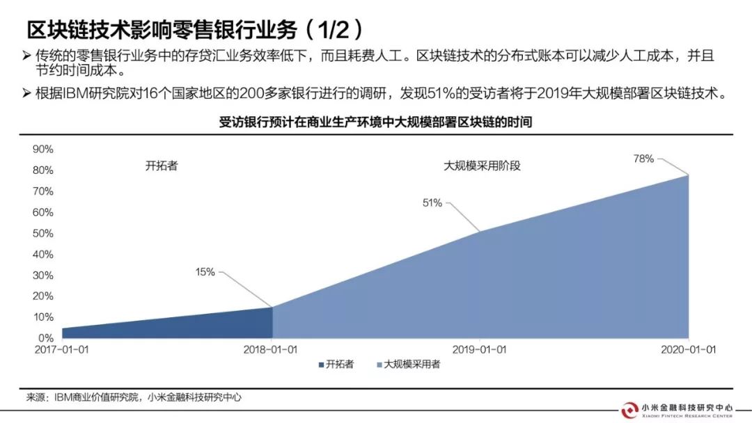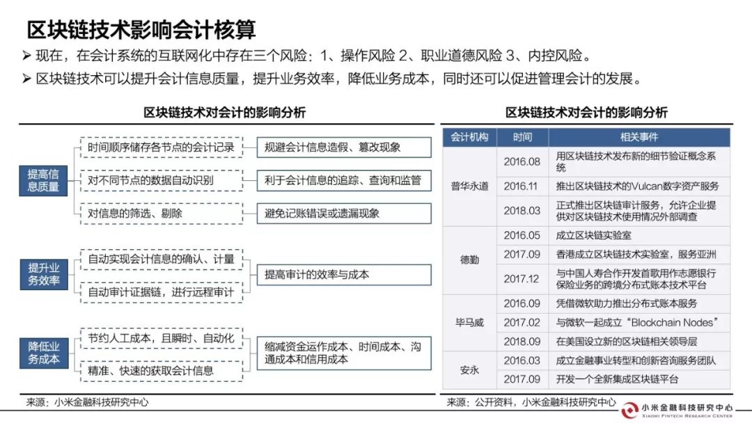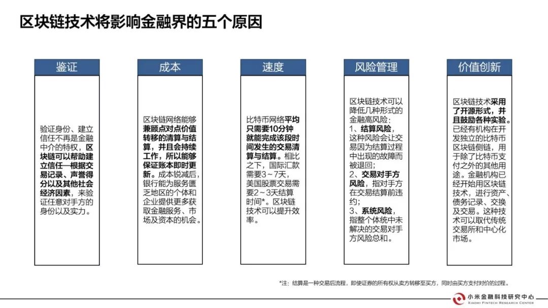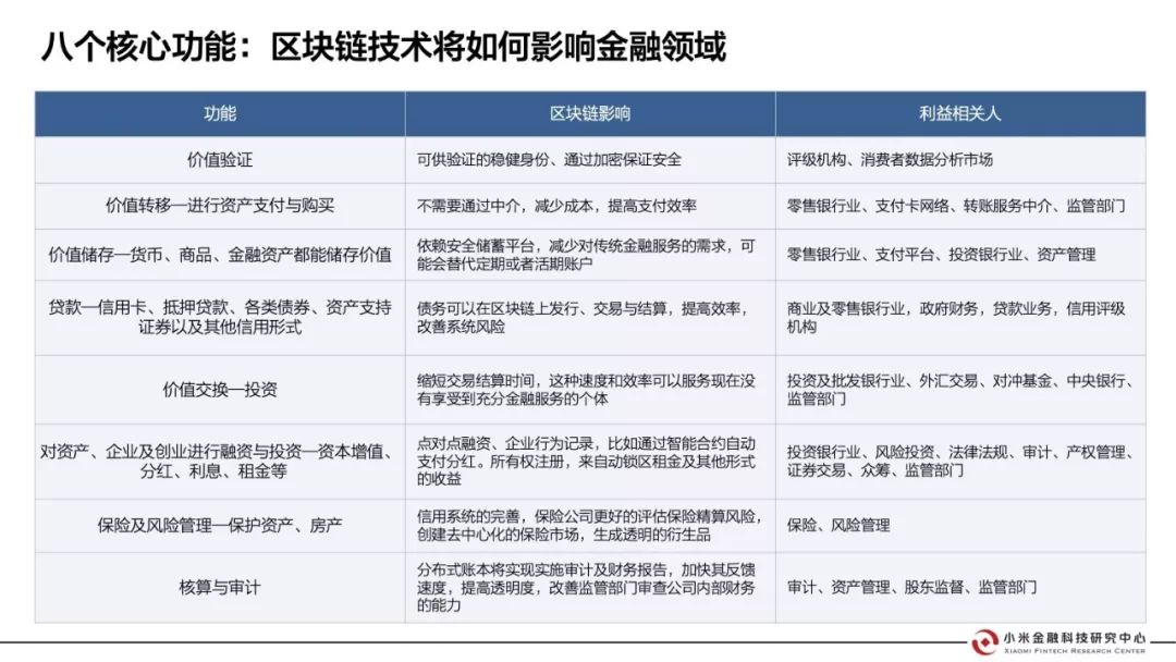 我们认为,区块链技术在金融领域中“鉴证、成本、速度、风险管理、价值创新”的五大优势将会深刻影响金融服务行业“价值验证,价值转移,价值储存,价值交换,贷款,融资与投资,保险及风险管理,核算与审计”的八个核心功能。未来,证券业务、零售银行业务、会计核算业务、供应链金融业务以及保险业务将在区块链技术的影响下产生较大的变化。