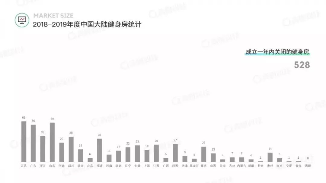 但同时也要看到,去年共有3099家健身房关闭,关闭率为4.36%,成立一年内关闭的健身房528家。整个行业的竞争还是比较激烈的,生存空间并非想象中的那么宽松。