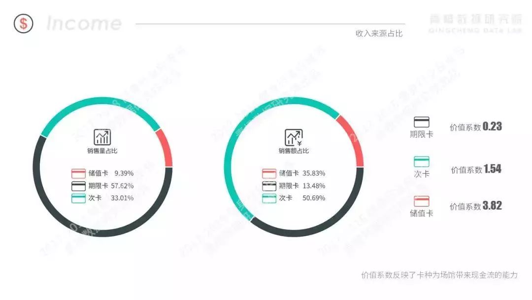 虽然在月收入方面,工作室和俱乐部呈现出一增一降的态势,但在会员来源方面却是一致的。工作室续卡用户和新开卡用户的比例为17.46%:82.45%,俱乐部续卡会员和新开卡会员的比例为11%:89%。可见无论健身房还是工作室,新增用户是都是其主要收入来源,健身房在日后需要在保持新开卡用户持续增长的同时,提升续卡用户比例,挖掘和满足更多的用户需求。