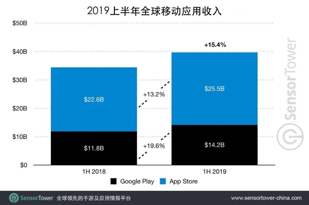 Sensor Tower商店情报最新数据显示,2019年上半年全球移动用户在 App Store 和 Google Play 的应用内总消费达到397亿美元,较2018年上半年344亿美元增长15.4%。