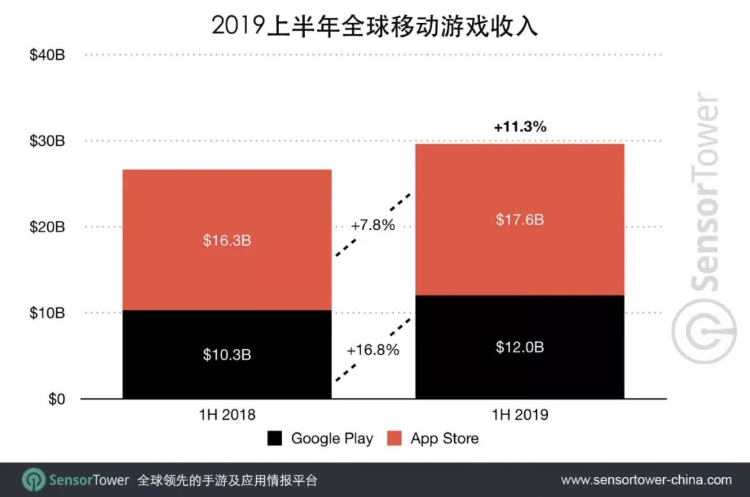 上半年全球移动游戏在 App Store 和 Google Play 预估总收入达到296亿美元,同比上涨11.3%。受中国iOS市场低迷和游戏版号影响,上半年 App Store 手游全球预估收入为176亿美元,较去年同期增长7.8%。而 Google Play 手游继续保持16.8%的高速增长,上半年全球收入达到 120亿美元。