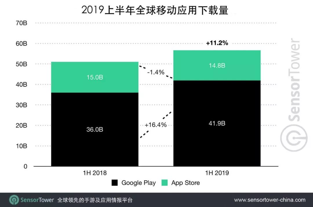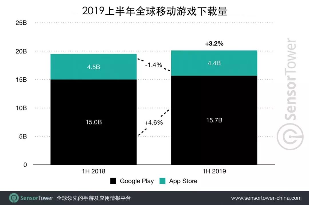 上半年全球手游下载量达到201亿次,较去年同期上涨3.2%。受前述因素影响,iOS手游下载量为44亿次,较去年同期下滑1.4%,而 Google Play 手游下载量增长4.6%至157亿次。