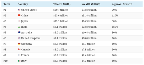 报告考察了全球最富有的10个国家以及2008年至2018年私人财富的增长情况,并对未来10年的变化进行了预测。