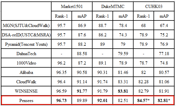 近日,国内人工智能企业澎思科技(Pensees)在行人再识别(Person Re-identification,简称ReID)算法上取得突破,在三大主流ReID数据集测试Market1501,DukeMTMC-reID,CUHK03中,算法关键指标首位命中率(Rank-1 Accuracy)获得业内最好成绩,刷新了世界纪录。