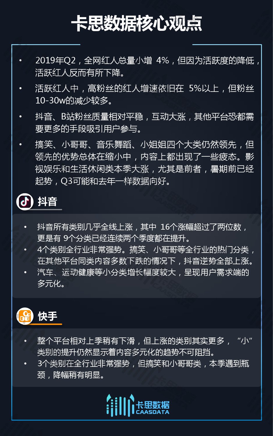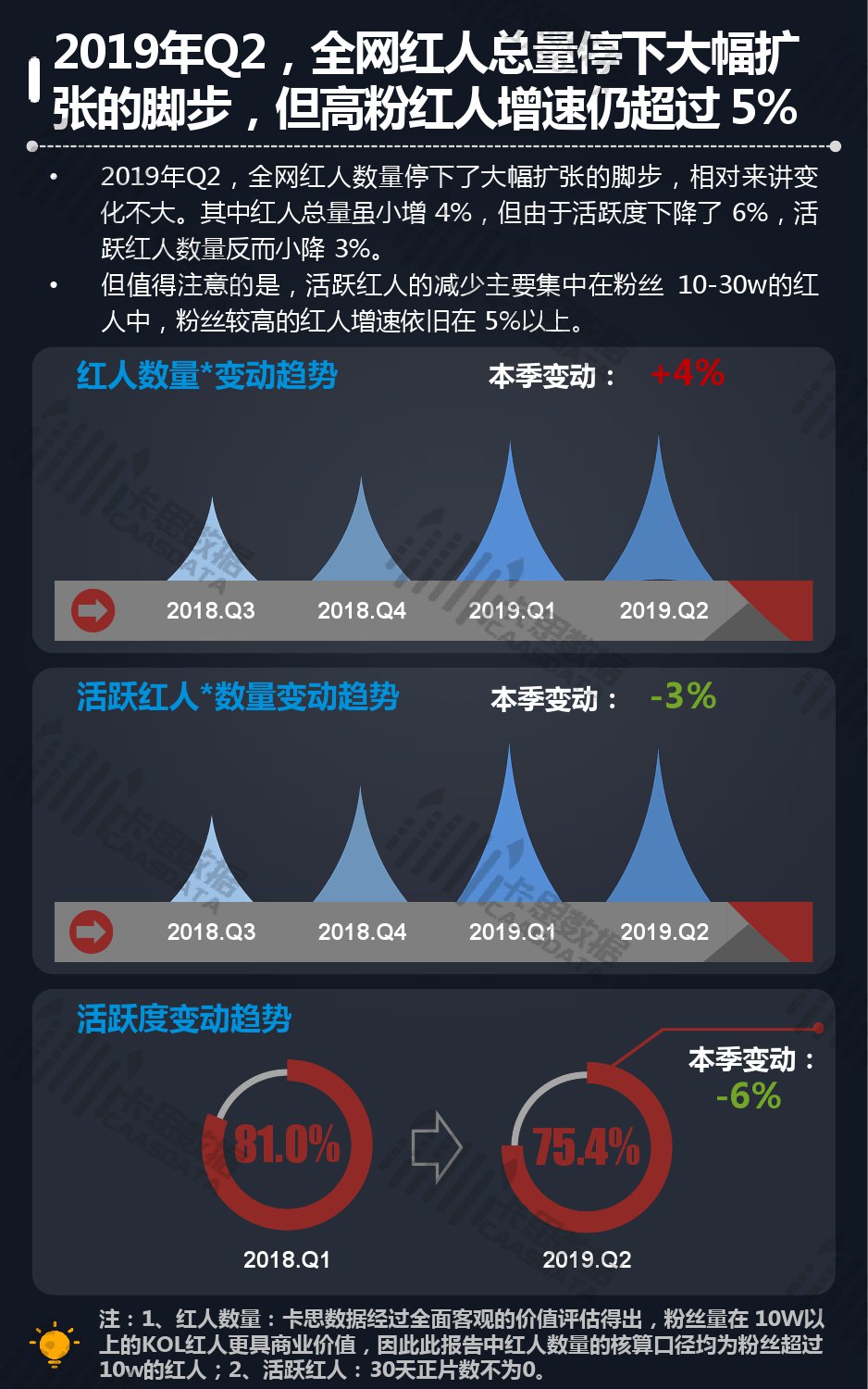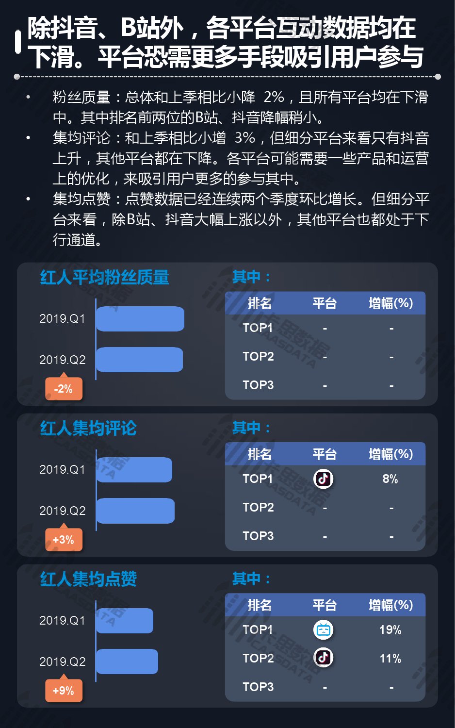 2019年第二季度,全网红人总量小增4%,但是因为活跃度下降了6%,活跃红人数量反而小降3%,不过值得注意的是活跃红人的减少主要集中在粉丝10w-30w的红人中,高粉红人增速仍超过5%; 另外,红人粉丝质量总体和上季相比小降2%,且所有平台均在下滑中。